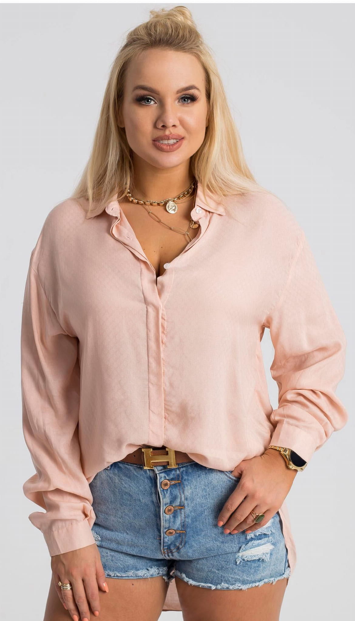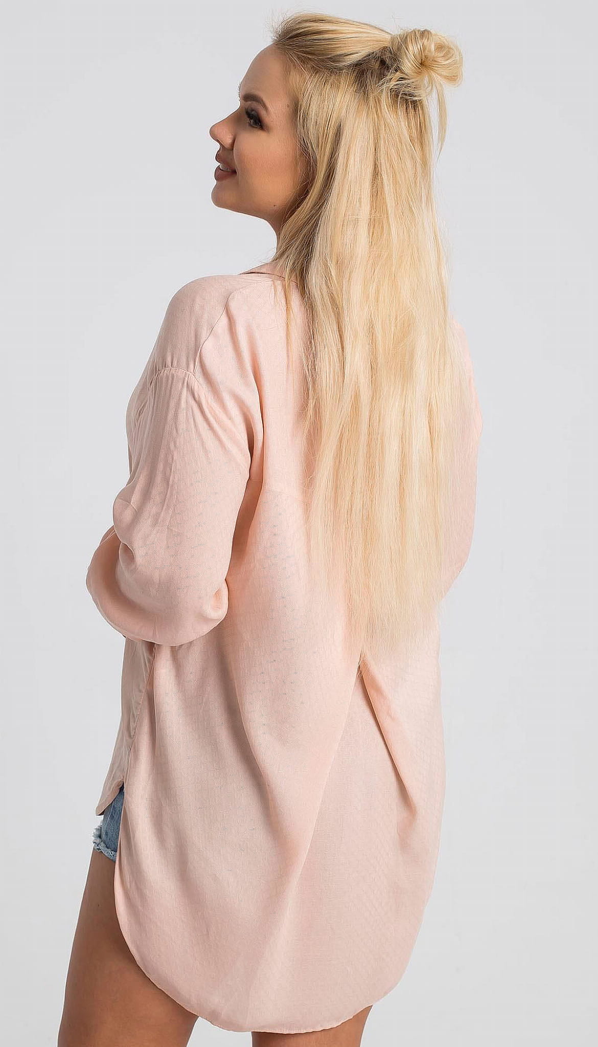 Zwiewna i elegancka zapinana bluzka koszulowa z kontrafałdą z tyłu. Kontrafałda skrzętnie zatuszuje szerszą pupę i doda uroku całości. Koszula z kołnierzykiem, materiał lejący, ładnie się układa. Delikatny wzorek na materiale. Koszula idealna na sezon wiosna, lato. Fajnie zaprezentuje się z jeansami albo z getrami. Można ją też założyć do ołówkowej spódniczki.