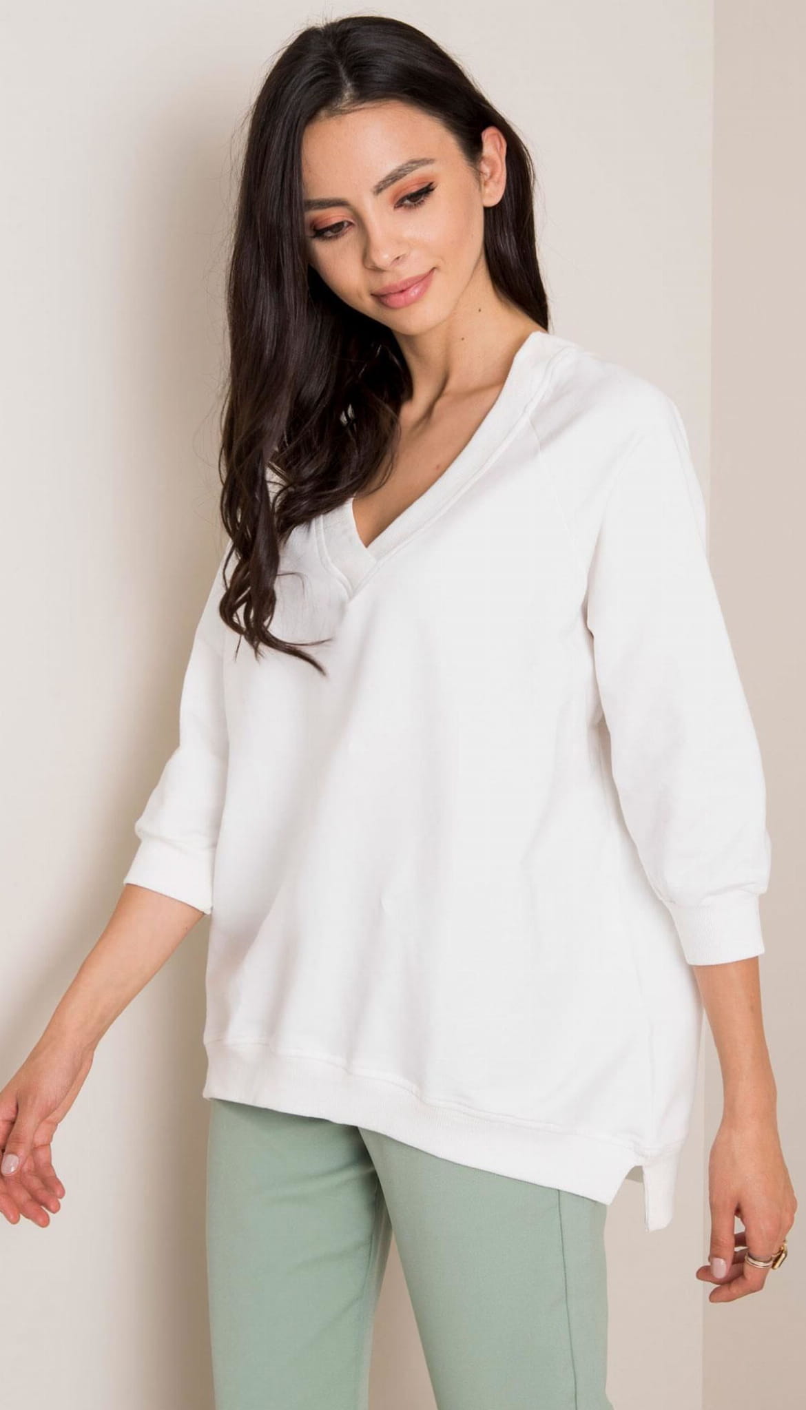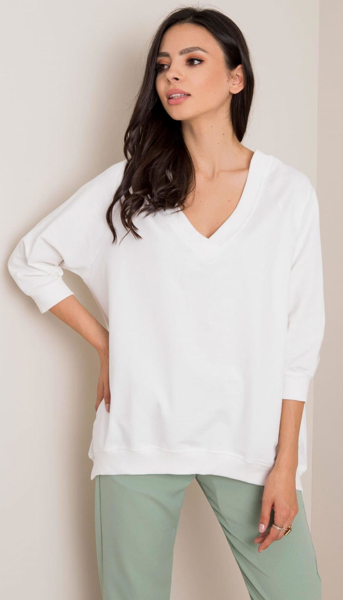 Elastyczna bawełniana bluza z dekoltem V z przodu i z tyłu. Bawełna 90% elastan 10%. Wygodna. Dekolt V wydłuża szyję i ładnie podkreśla biust. W sam raz na co dzień, świetnie nada się też na wyjścia do sklepów, spacery czy w połączeniu ze spódnicą ołówkową lub klasycznymi jeansami - stworzy ciekawą sportową stylizację.
