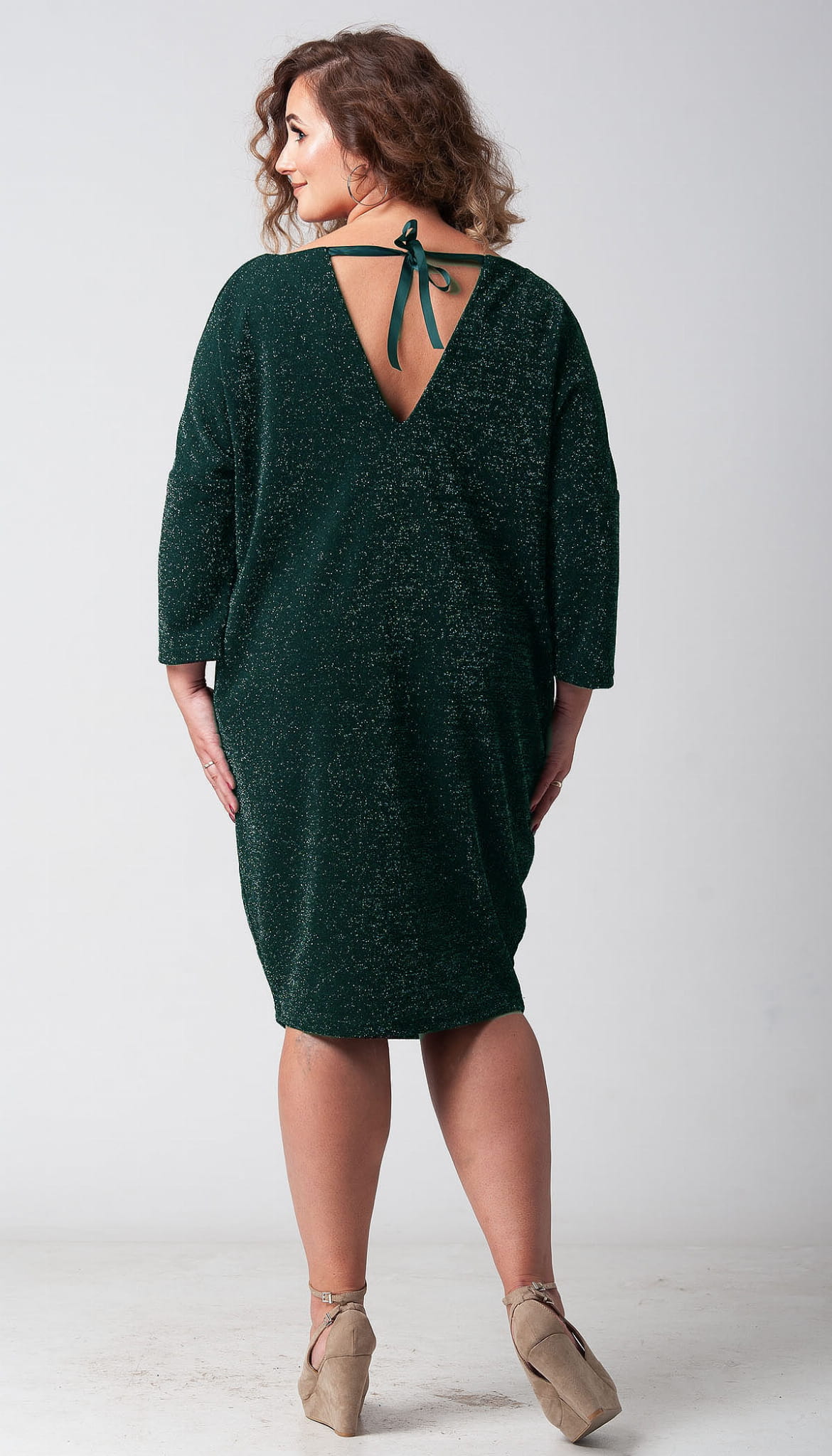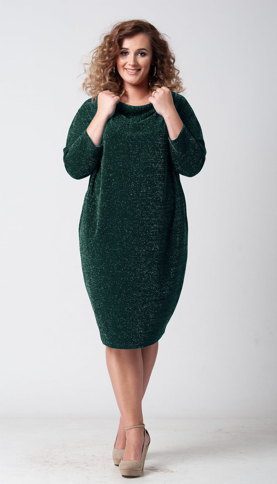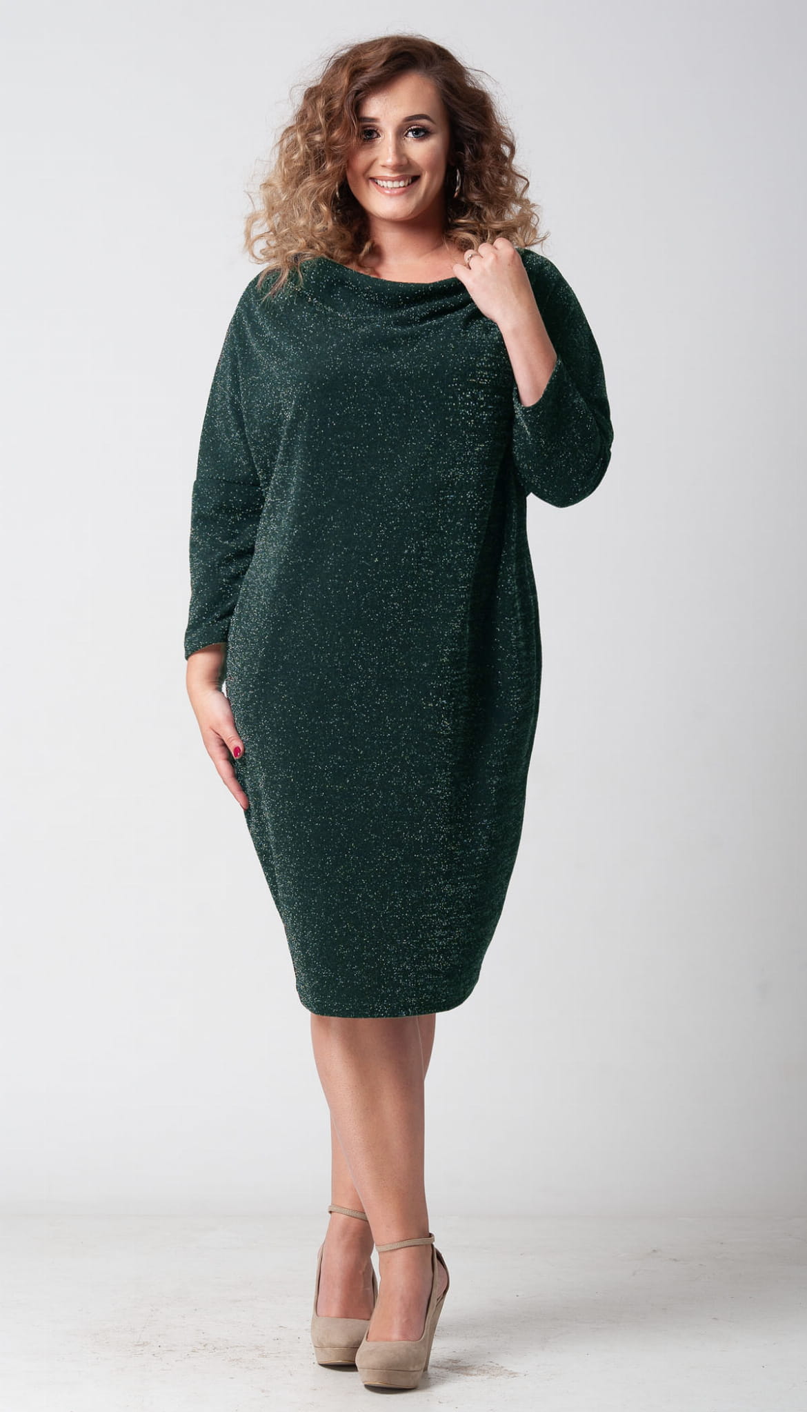 Niezwykle elegancka a zarazem skromna sukienka o kroju tuby dla Pani w rozmiarze XXL. Rękawy kimonowe. Uszyta z elastycznej DZIANINY ZE SREBRNĄ NITKĄ. Dzianina wygodna, mocno elastyczna, od wewnątrz gładka, nie gryząca. Zabłyśnij i ukryj niedoskonałości!