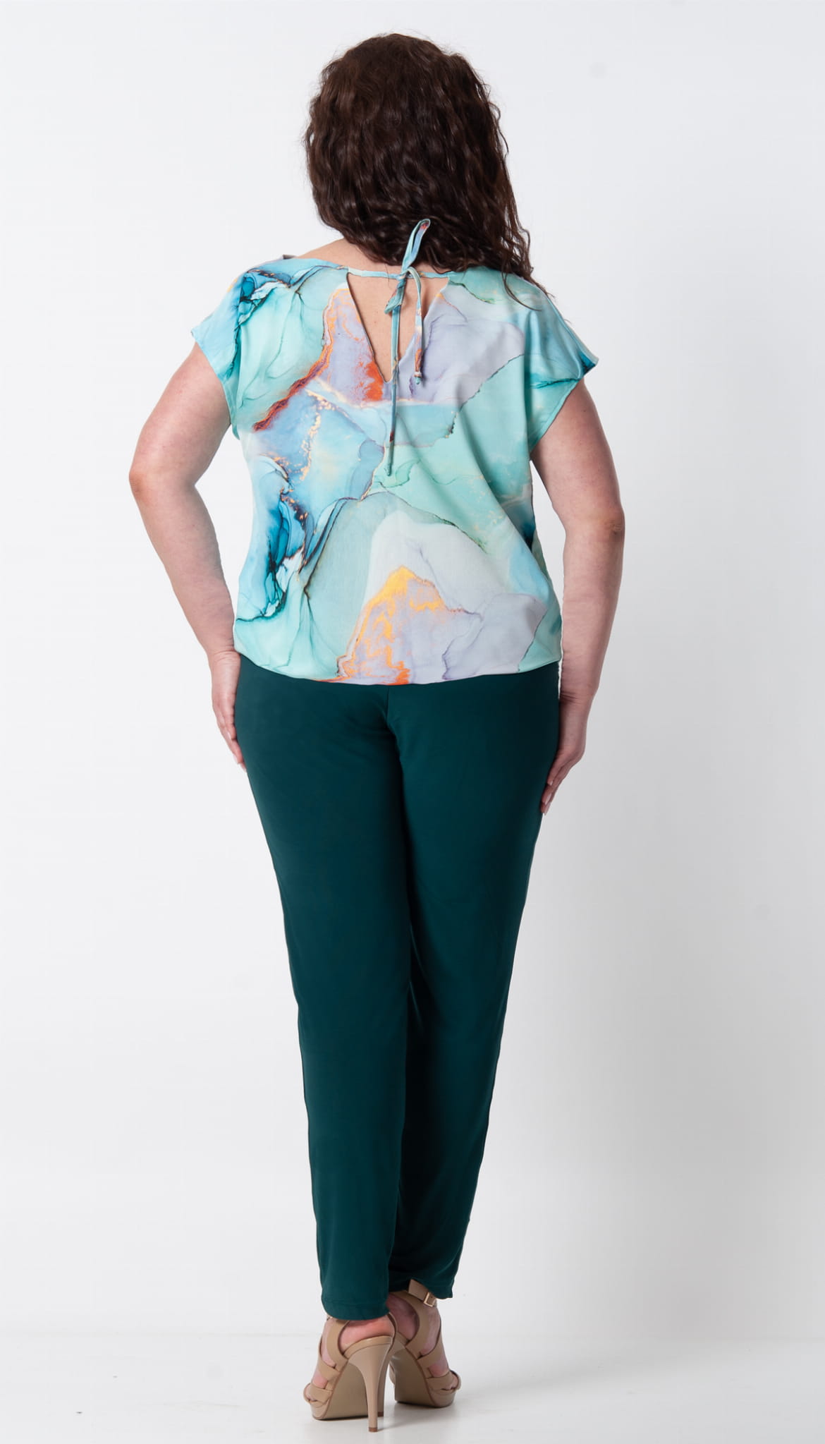 Szerokość góry kombinezonu można dowolnie regulować, żeby opadał na ramiona lub nie. W pasie wszyta nieuciskająca szersza guma. Góra kombinezonu lejąca. Spodnie zwężane ku dołowi, z wysokim stanem, zwężane cygaretki.