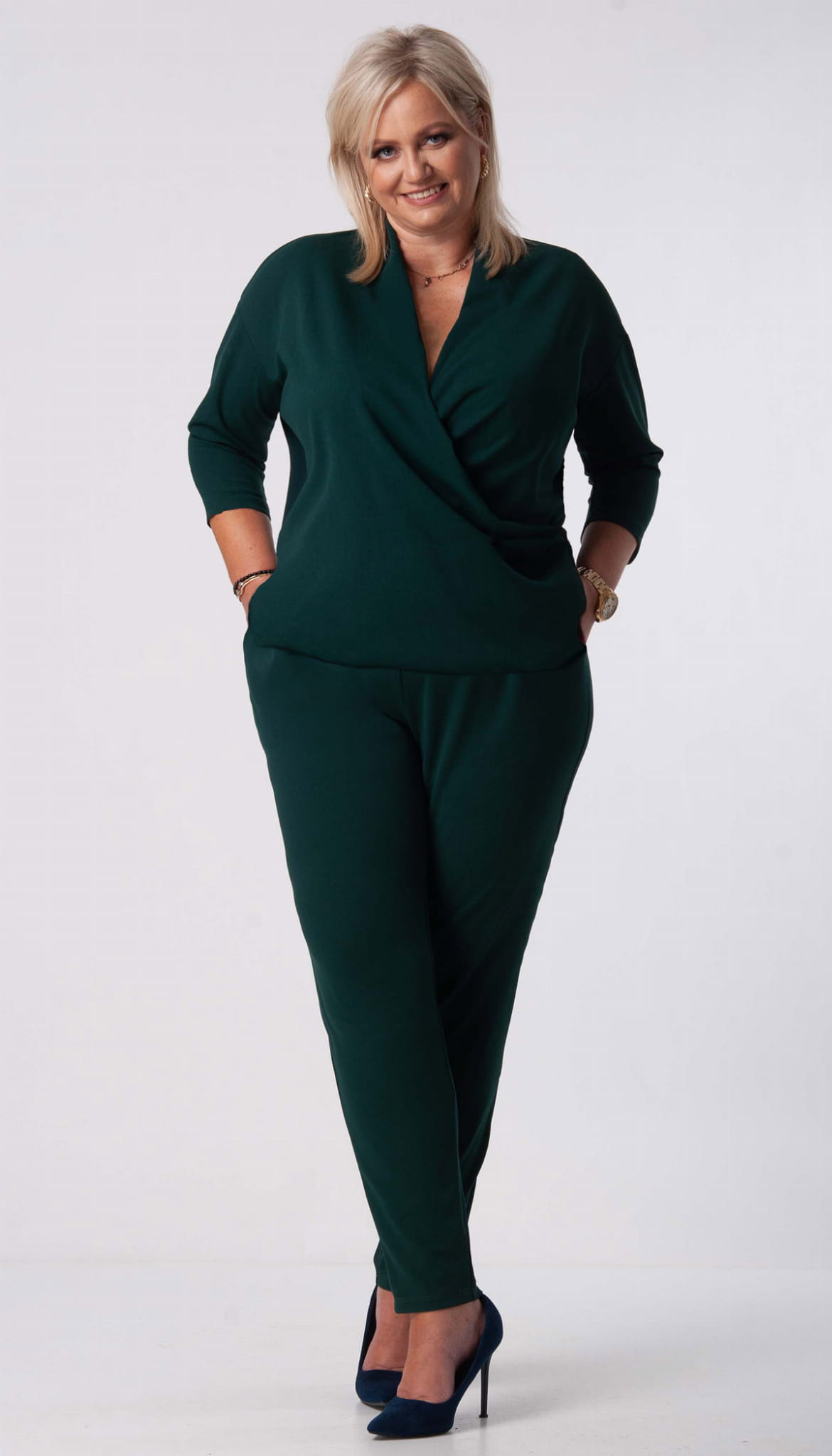 Wyjątkowo elegancki kombinezon dla Pań w rozmiarach Plus Size. Uszyty z lekkiej eleganckiej tkaniny z dużym dodatkiem elastanu. Wygodny, idealny na przyjęcie w okresie całego roku. Zbluzowana góra ładnie tuszuje mankamenty w okolicach brzuszka. Bluzka z boku posiada drapowanie dzięki czemu dekolt pięknie się układa. Dekolt kopertowy pięknie podkreśli kobiece kształty. Spodnie luźne w udach, klasyczne cygaretki zwężane ku dołowi. W talii wygodna guma. Kombinezon z kieszeniami. Materiał mocno eleastyczny. Masz wątpliwości co do rozmiaru - wybierz mniejszy.