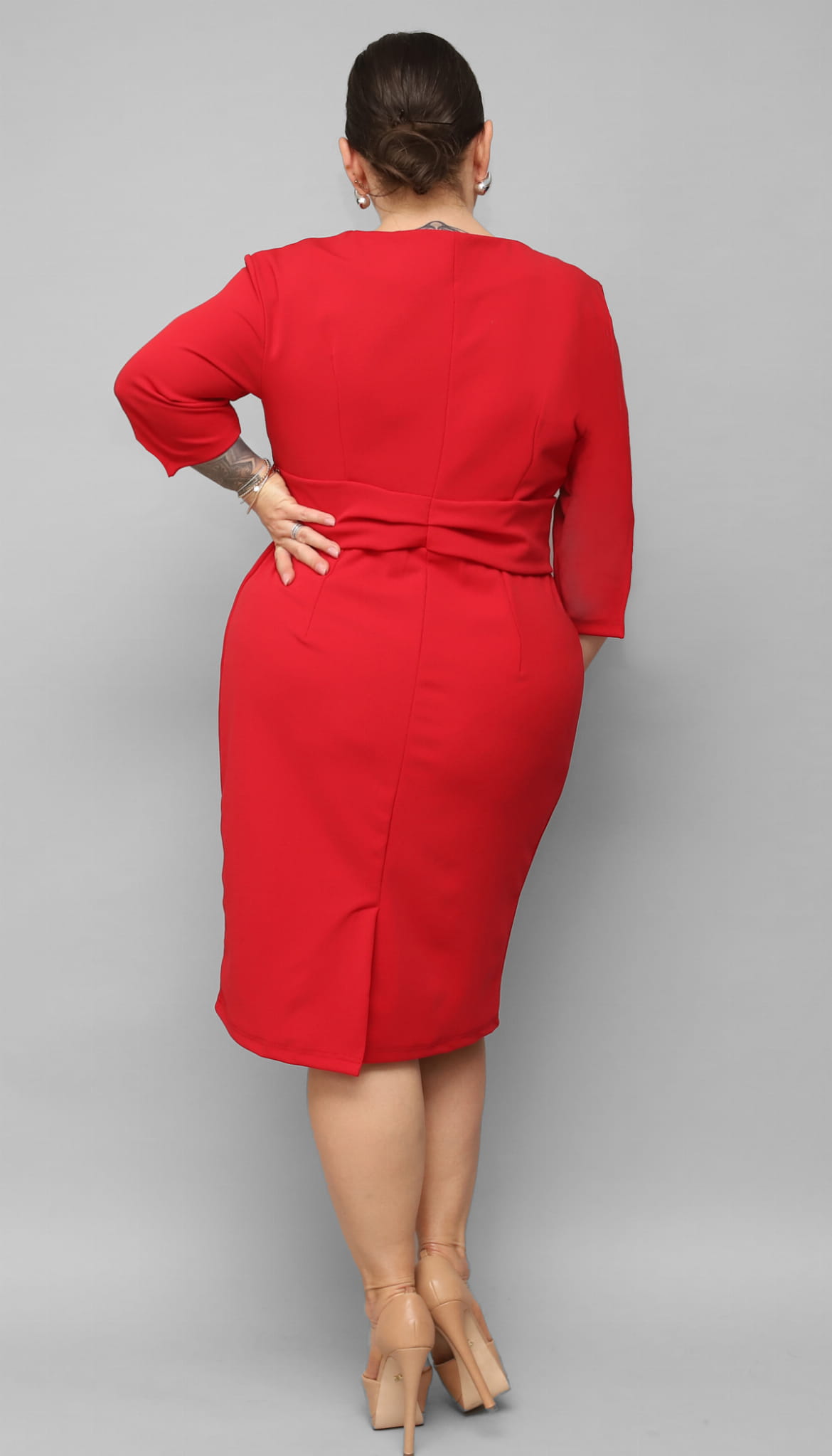 Elegancka kopertowa sukienka na okazjonalne uroczystości. Święta, wesele, uroczystość rodzinna. Nie przejdziesz w niej niezauważona. Piękny kopertowy dekolt podkreśli atuty każdej XXL-ki. Sukienka odcinana pod biustem lekko marszczonym elastycznym wygodnym pasem. Dzięki luzowi w okolicach talii, oraz oryginalnej zakładce i zaszewce, skrzętnie zatuszuje niedoskonałości figury a podkreśli jej atuty. Rękawek 3/4, wygodny, elastyczny. Z tyłu kryty rozporek. Sukienka przy wzroście 170cm lekko zakrywa kolanko.