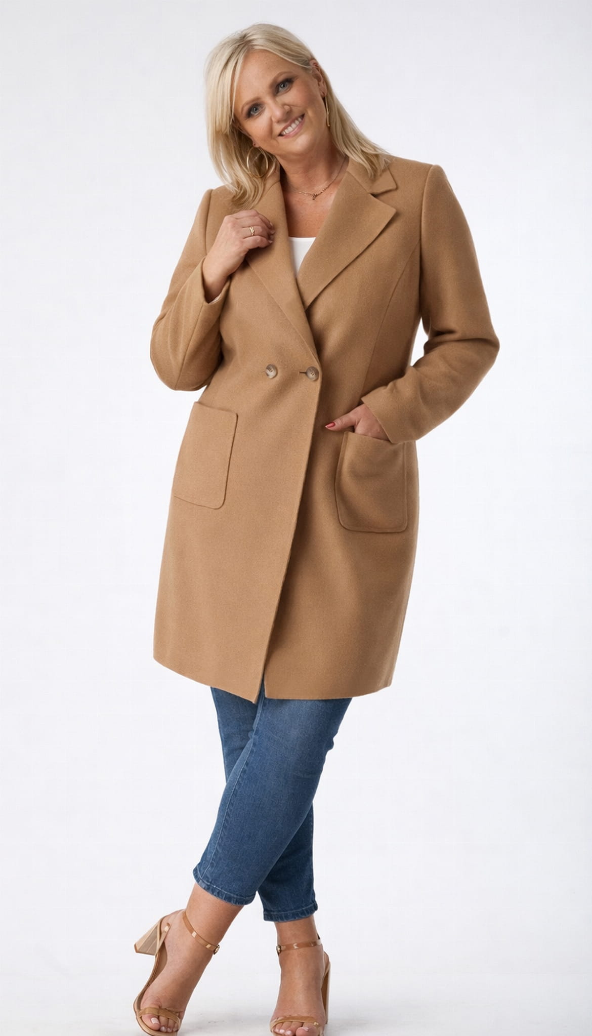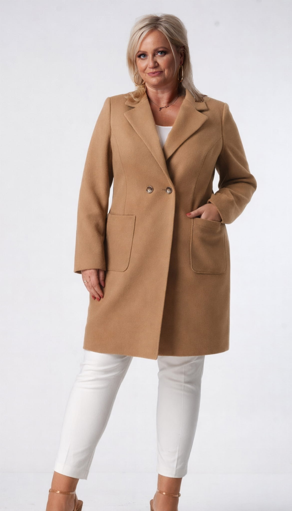 Klasyczny uniwersalny fason. Każda XXL-ka poczuje się w nim niezwykle elegancko. Wykładany kołnierz można postawić a`la stójka lub standardowo nosić jak na zdjęciu. Naszywane ciekawe, wygodne kieszenie.