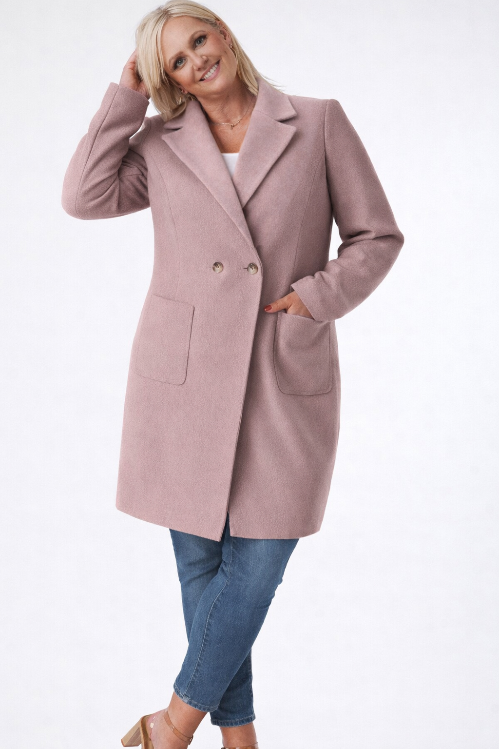 Klasyczny uniwersalny fason. Każda XXL-ka poczuje się w nim niezwykle elegancko. Wykładany kołnierz można postawić a`la stójka lub standardowo nosić jak na zdjęciu. Naszywane ciekawe, wygodne kieszenie.