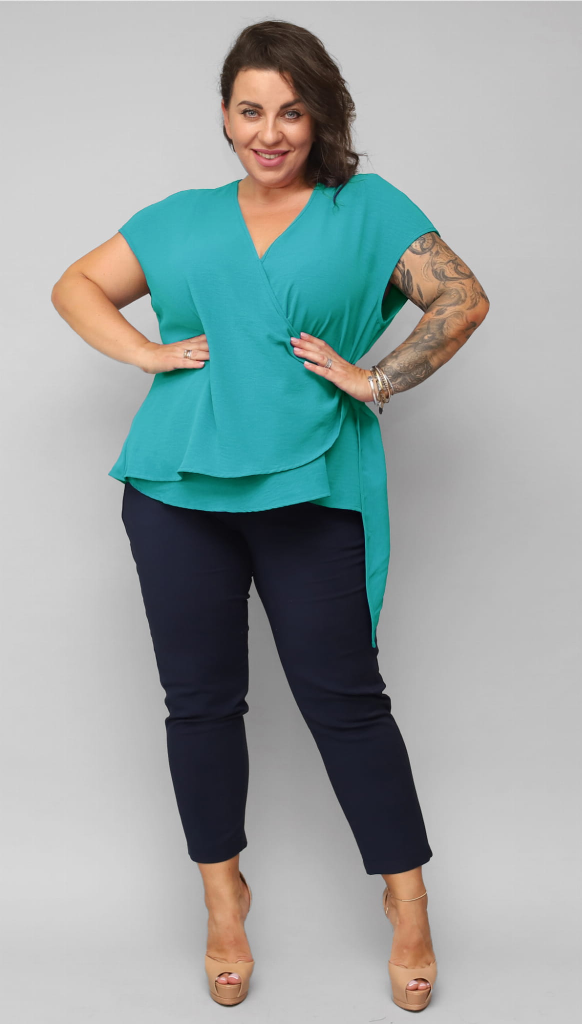 Nela, wyjątkowa bluzeczka z regulacją dla Pań w rozmiarach XXL. Z tyłu lekko dłuższa z przodu z zakładanym podwójnym dekoltem kopertowym. Bluzka z boku ma tunel do którego wkłada się doszyty z przodu pasek. Same możemy ustalić jak mocno chcemy żeby bluzeczka nas opinała. Idealna jest dla Pań z większym brzuszkiem, przednia warstwa bluzki zasłoni zupełnie tą niedoskonałość. Paskiem możemy podkreślić linię lekko poniżej biustu. Możemy mocniej dopasować do figury lub puścić luźniej.