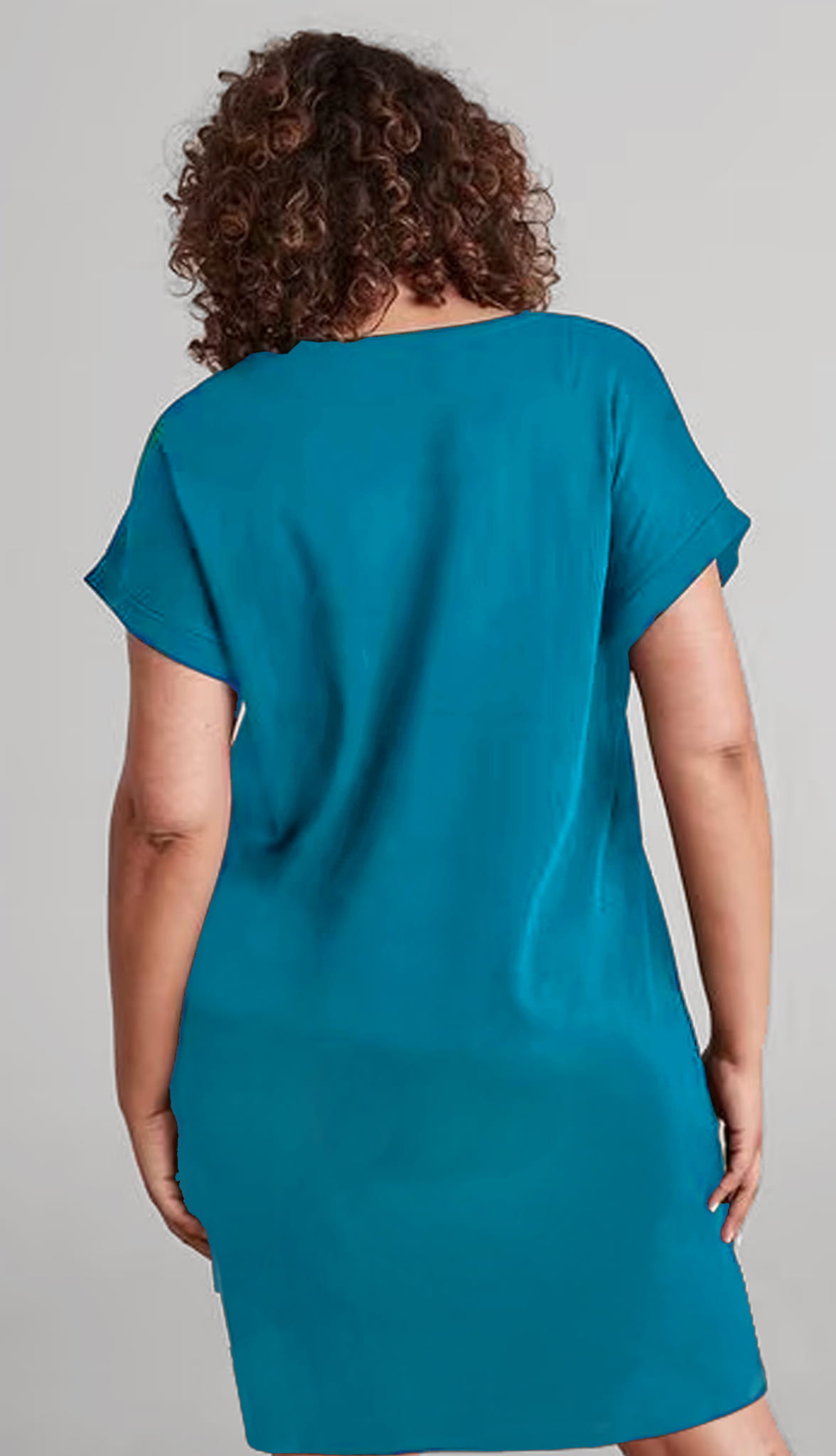 Sukienka dobra dla Pań w większych rozmiarach lekko poszerzna w talii dzięki czemu daje swobodę ruchów i tuszuje niedoskonałości.