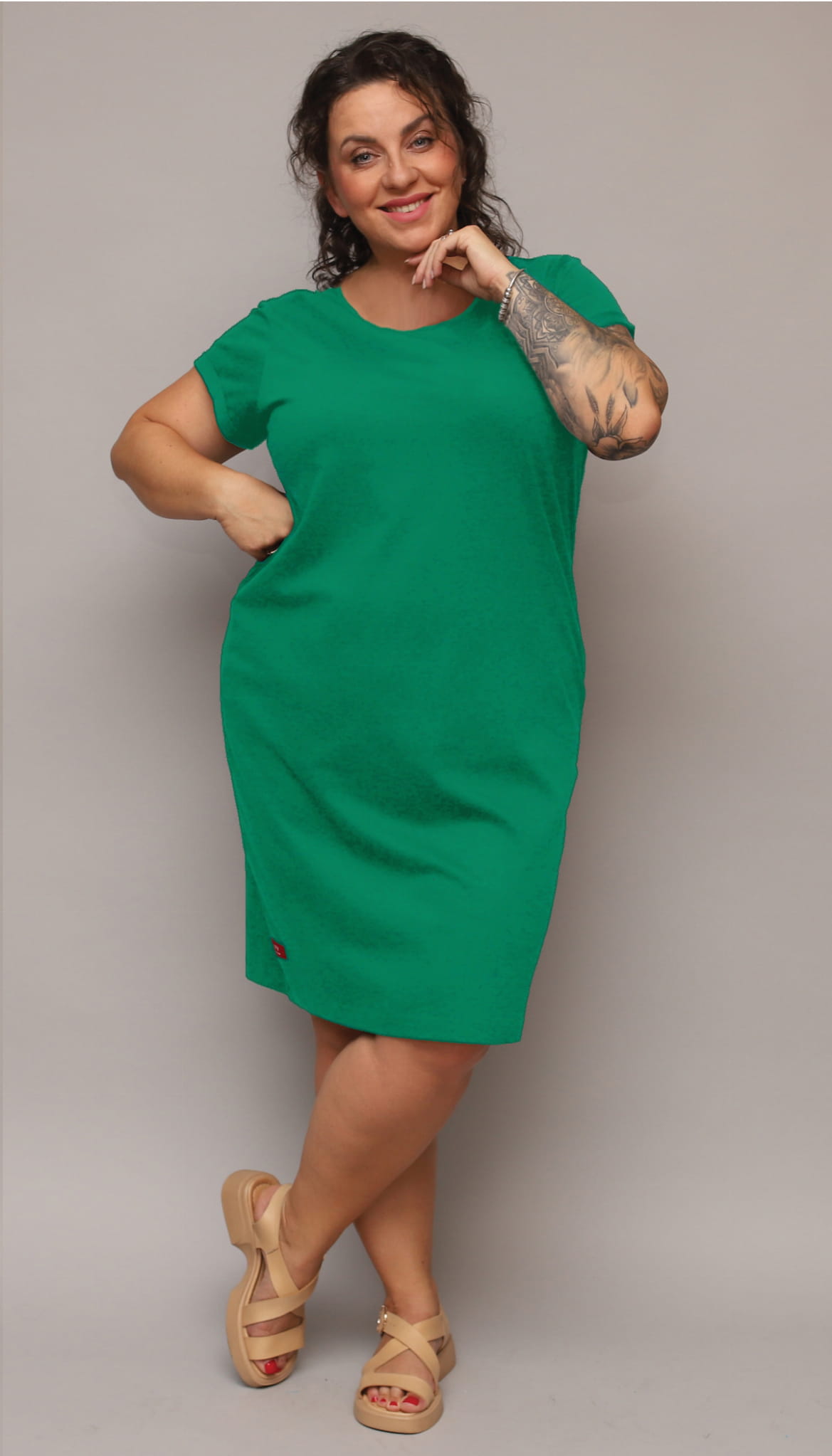 Sukienka dobra dla Pań w większych rozmiarach lekko poszerzna w talii dzięki czemu daje swobodę ruchów i tuszuje niedoskonałości w okolicach brzuszka.