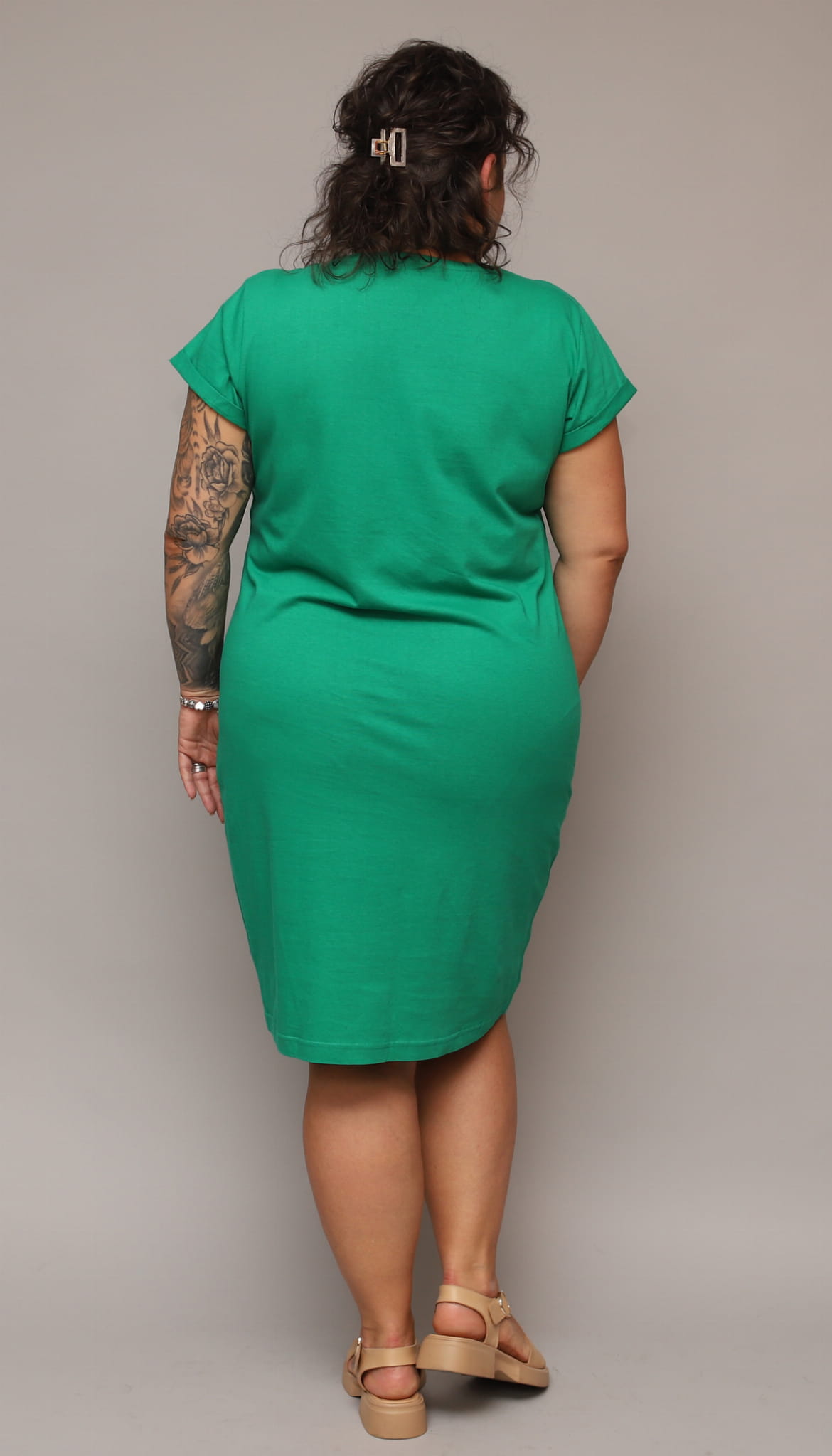 Idealna na ciepłe dni bawełniana sukienka do kolanka. Rękawek z podwinięciem, dekolt większy.