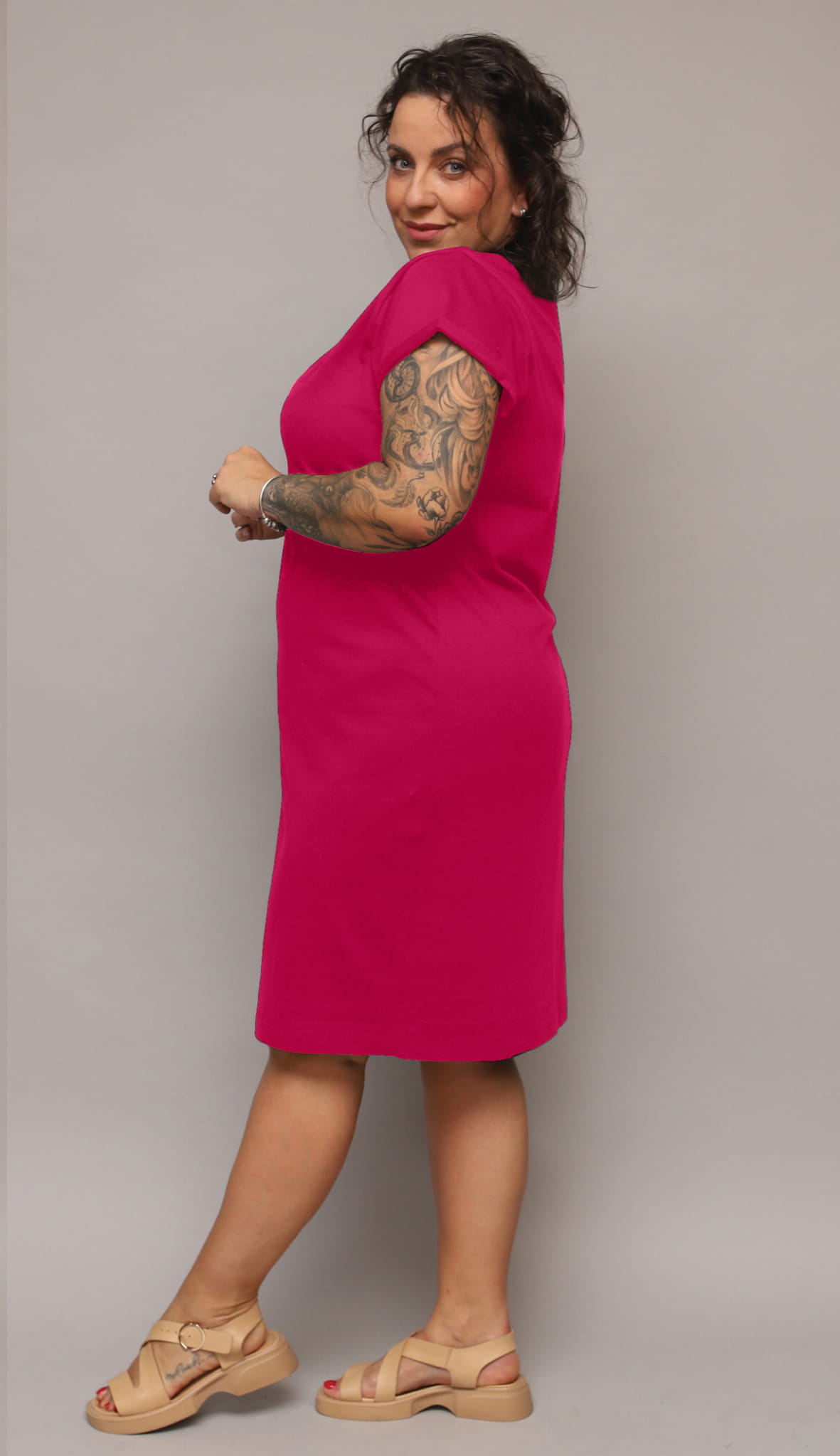 Idealna na ciepłe dni bawełniana sukienka do kolanka. Rękawek z podwinięciem, dekolt większy.