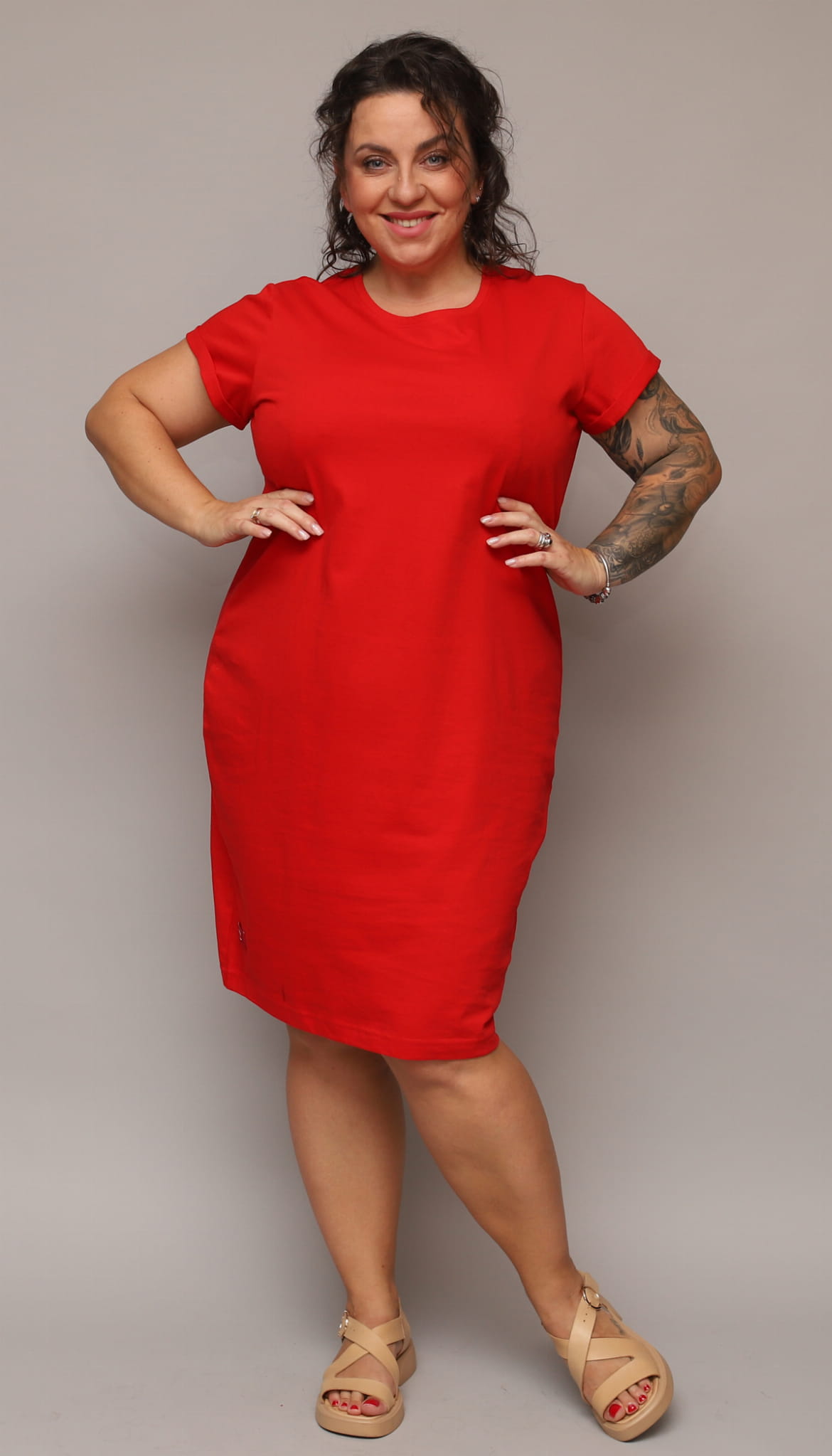 Idealna na ciepłe dni bawełniana sukienka do kolanka. Rękawek z podwinięciem, dekolt większy.