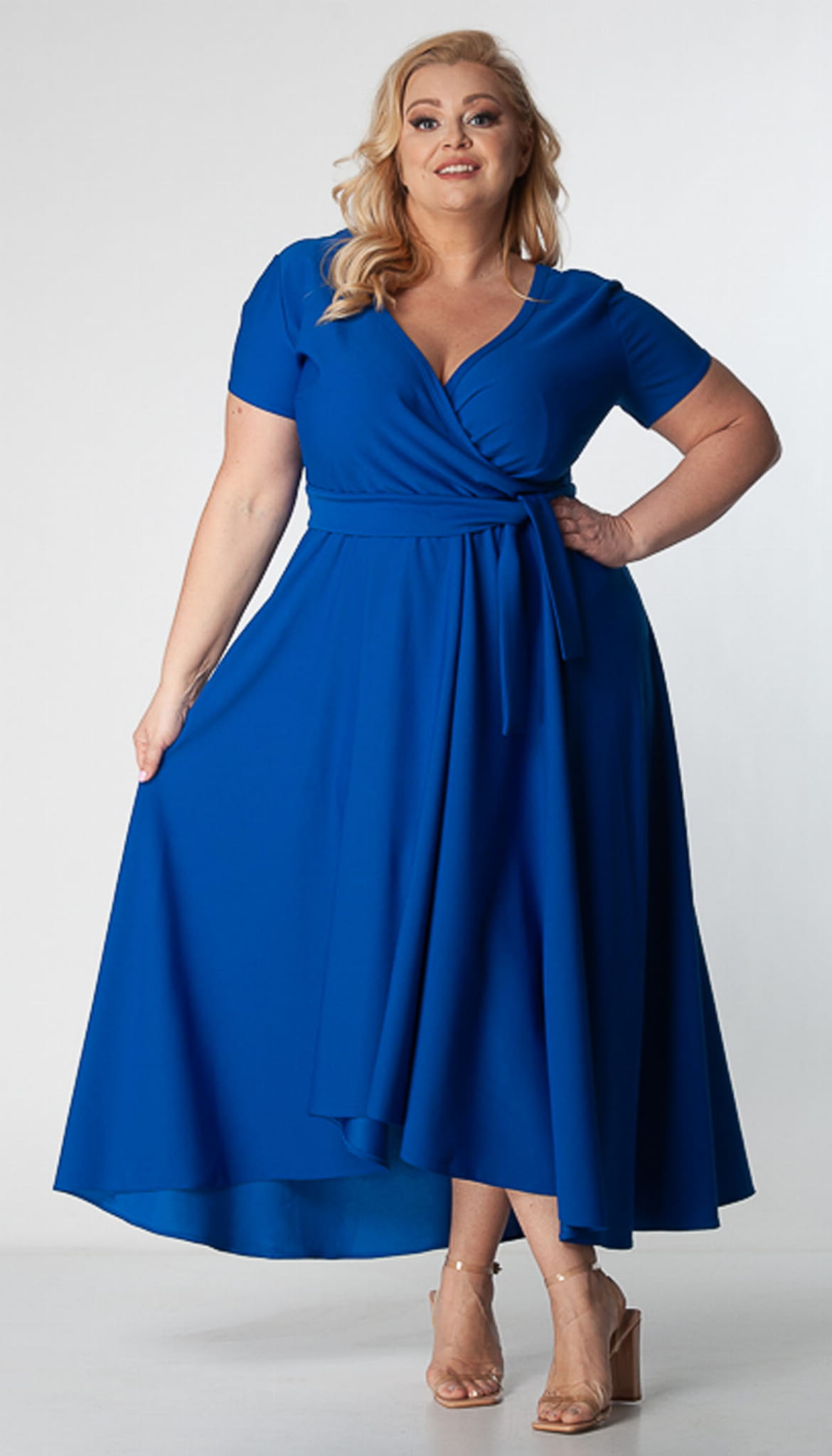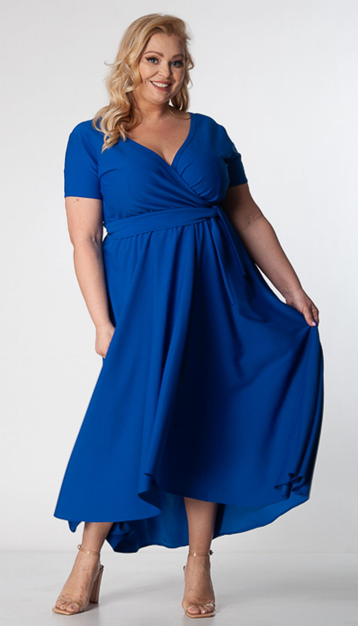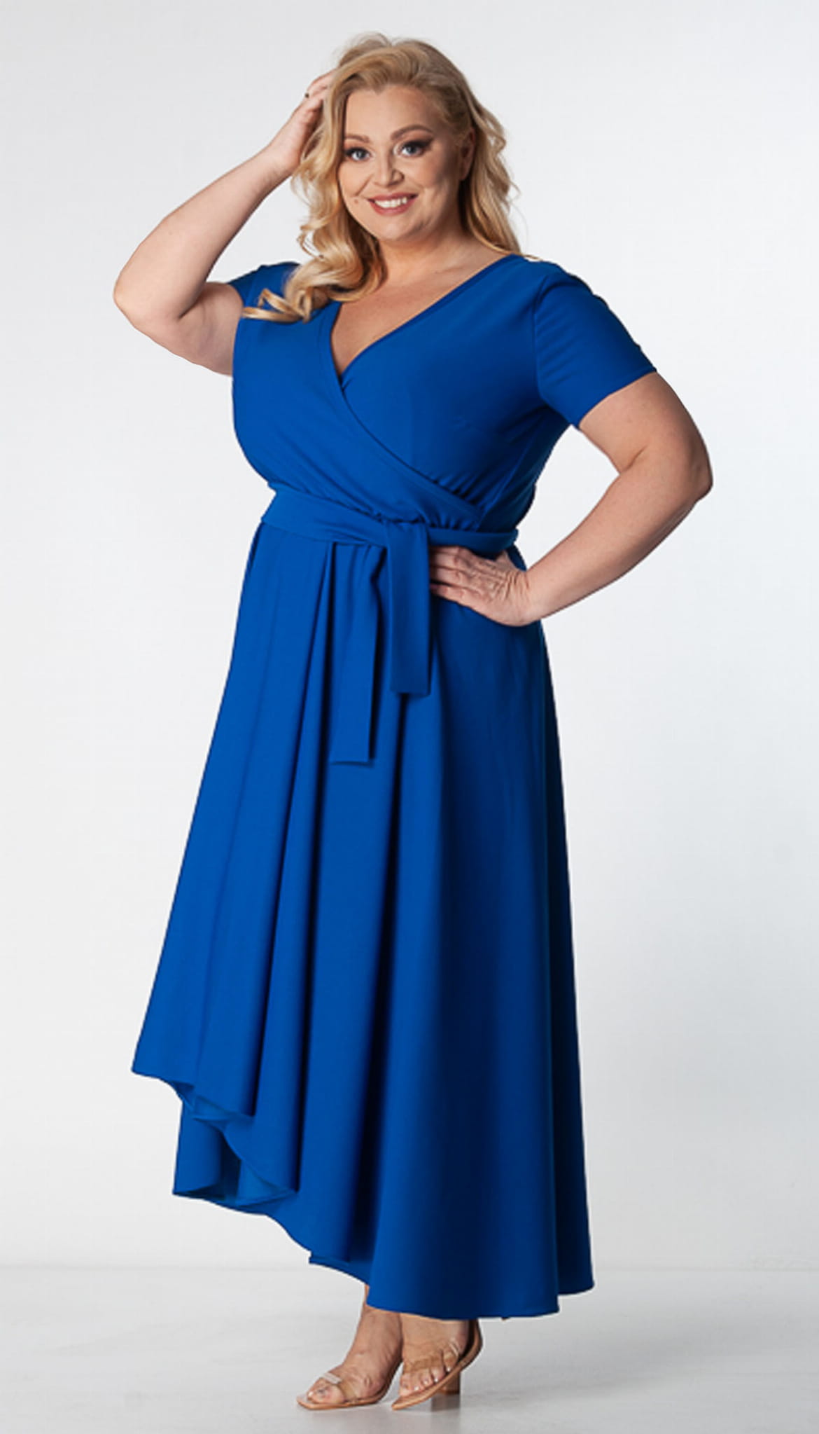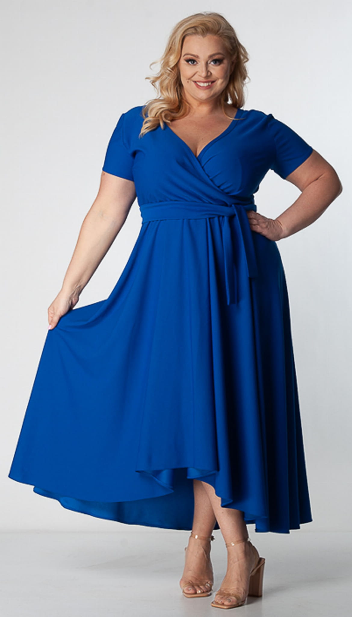 Sukienka Marta to propozycja na wyjątkowe wyjścia. Wesela, bale, studniówki. Idealna dla Pań noszących większe rozmiary. Wyjątkowo kobieca i elegancka. Kopertowy dekolt można odsłonić bardziej lub mniej, jest uciągliwy. Pod biustem wszyliśmy wygodną gumeczkę. Z tyłu, na plecach, zaszewki, głębszy dekolt i zapinanie na kryty suwak. Dół sukienki asymetryczny, rozkloszowany, z przodu z dwiema zakładkami które tuszują okolice brzuszka. Do sukienki dołączony jest pasek, można założyć lub nie. Sukienka bez podszewki.