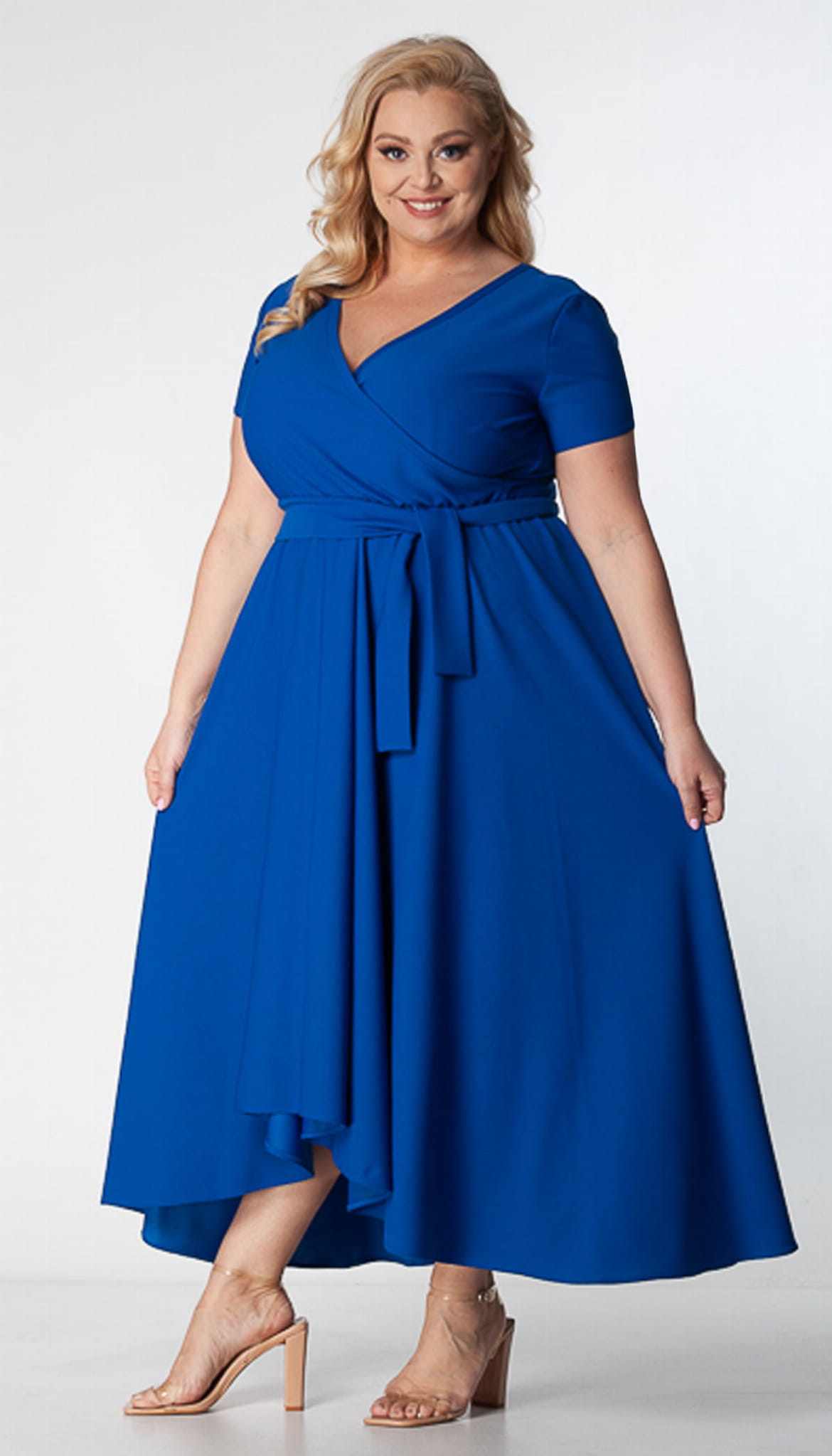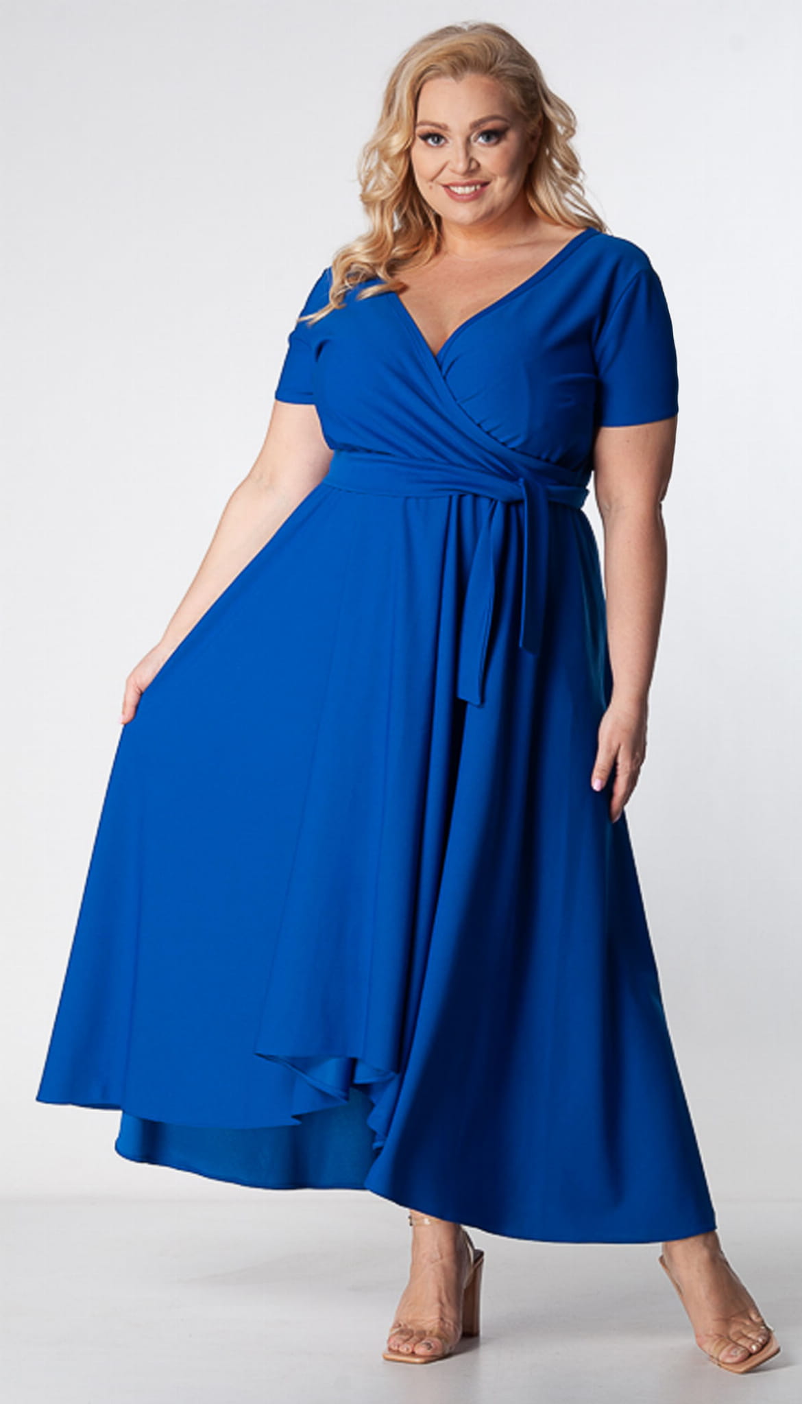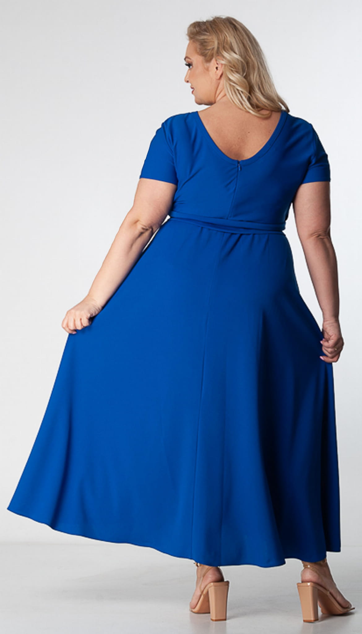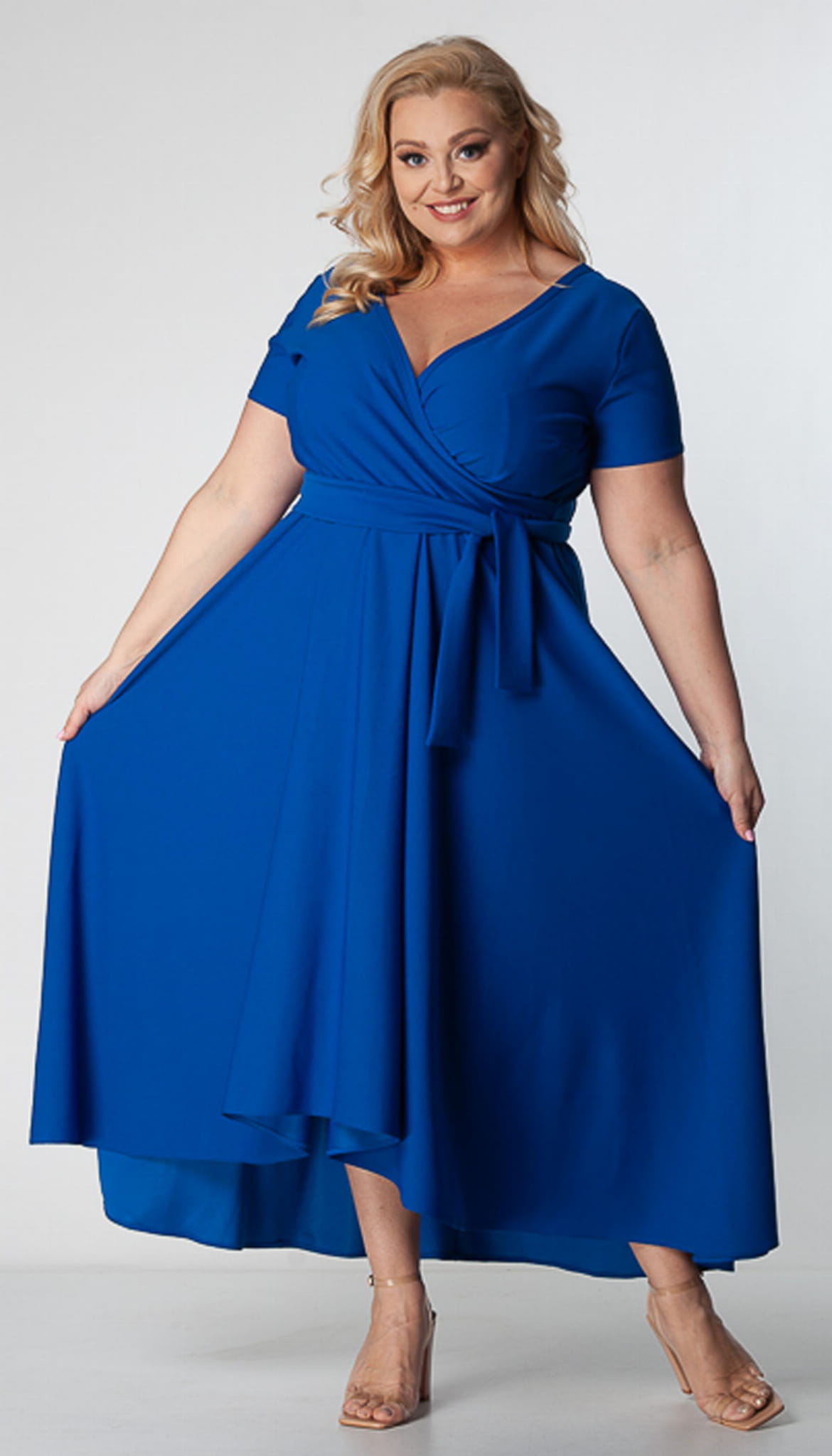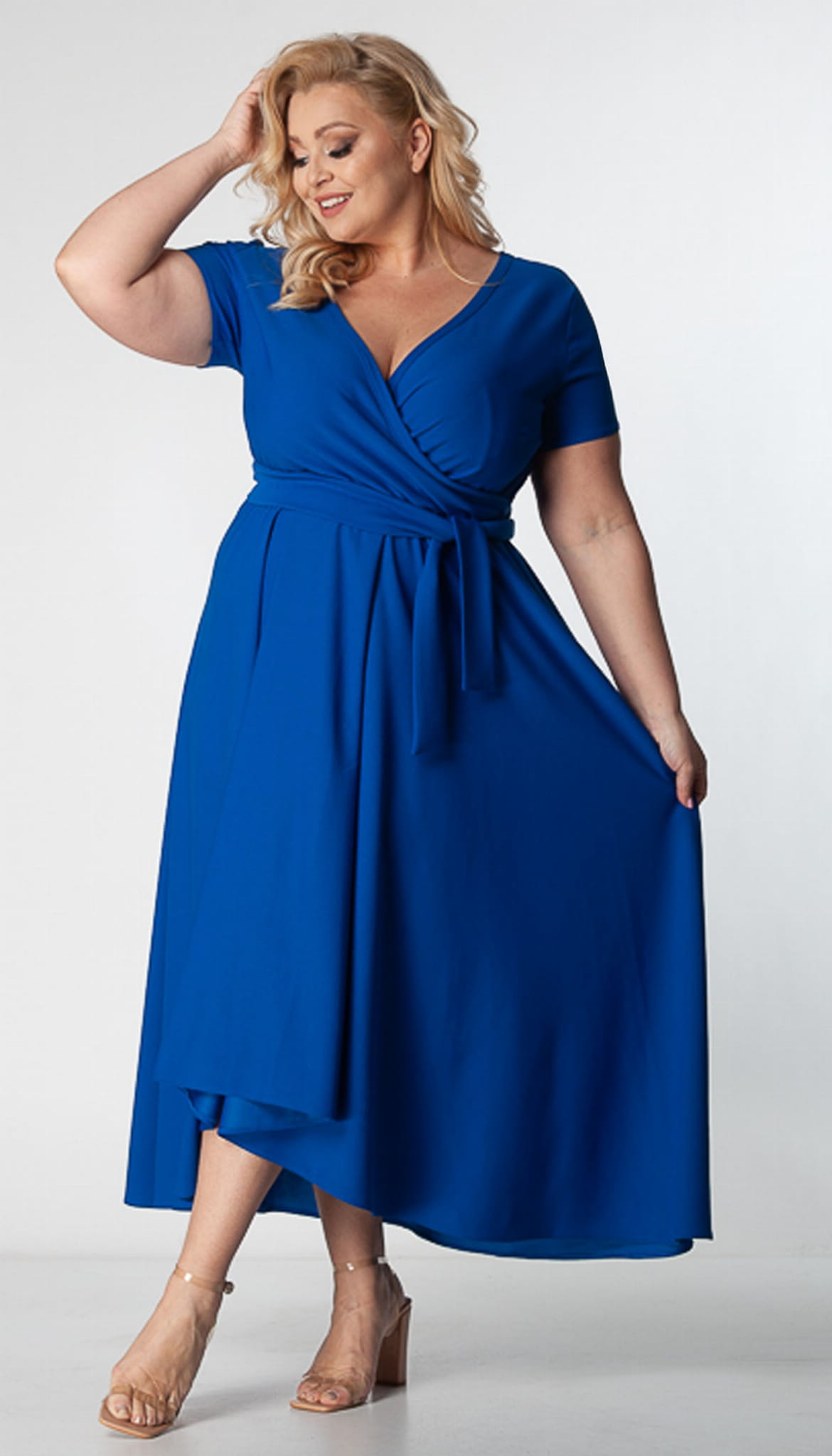 Sukienka Marta to propozycja na wyjątkowe wyjścia. Wesela, bale, studniówki. Idealna dla Pań noszących większe rozmiary. Wyjątkowo kobieca i elegancka. Kopertowy dekolt można odsłonić bardziej lub mniej, jest uciągliwy. Pod biustem wszyliśmy wygodną gumeczkę. Z tyłu, na plecach, zaszewki, głębszy dekolt i zapinanie na kryty suwak. Dół sukienki asymetryczny, rozkloszowany, z przodu z dwiema zakładkami które tuszują okolice brzuszka. Do sukienki dołączony jest pasek, można założyć lub nie. Sukienka bez podszewki.