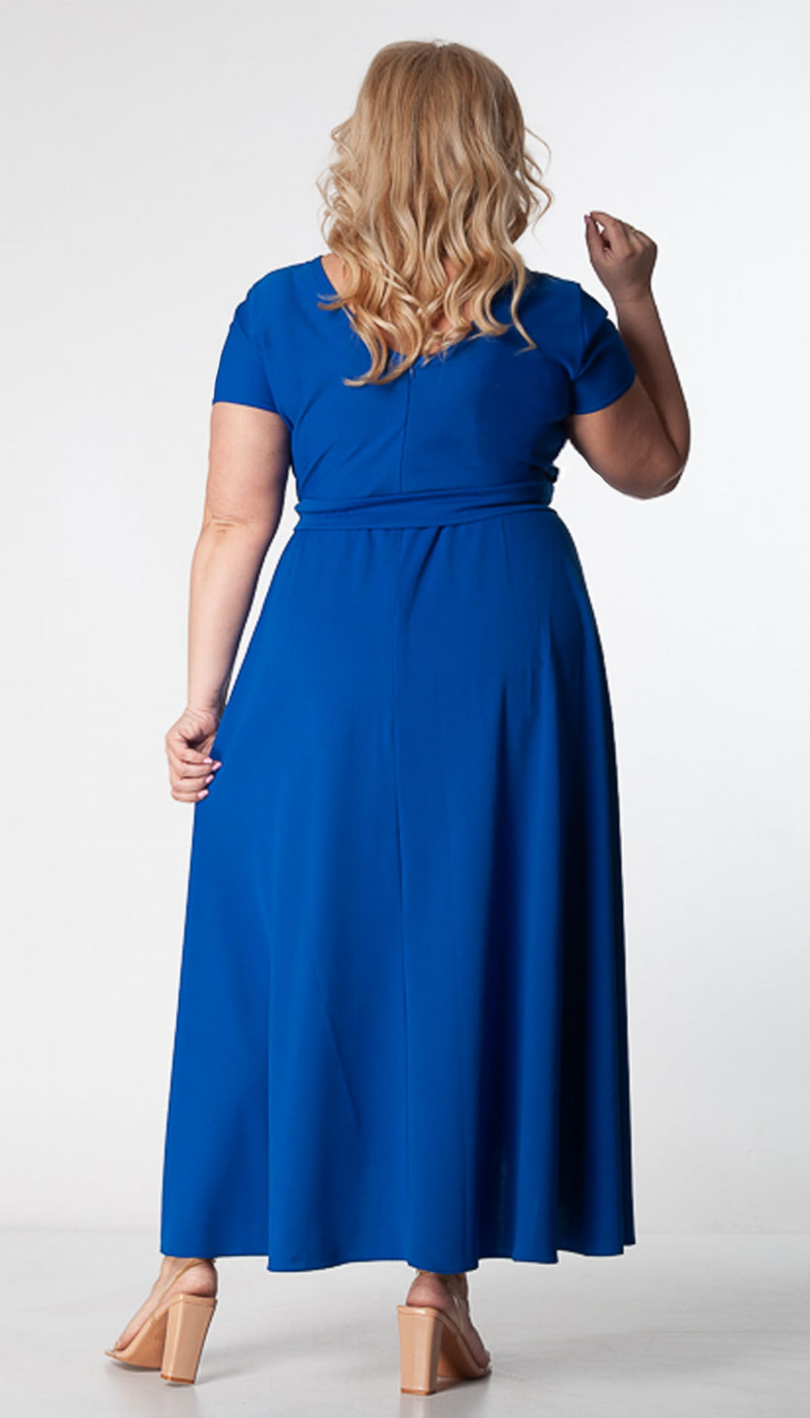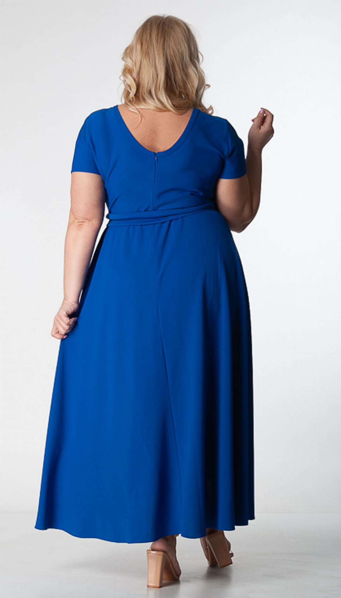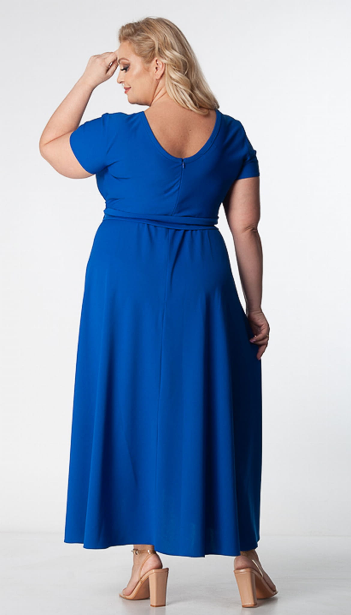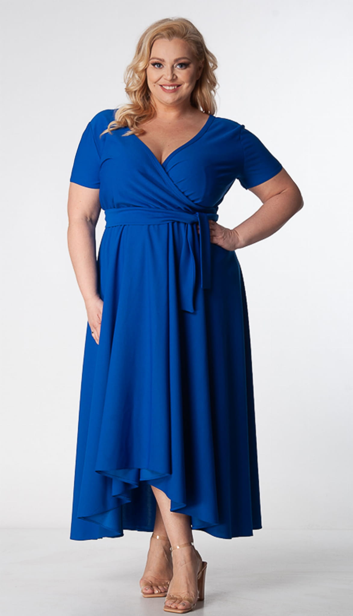 Sukienka Marta to propozycja na wyjątkowe wyjścia. Wesela, bale, studniówki. Idealna dla Pań noszących większe rozmiary. Wyjątkowo kobieca i elegancka. Kopertowy dekolt można odsłonić bardziej lub mniej, jest uciągliwy. Pod biustem wszyliśmy wygodną gumeczkę. Z tyłu, na plecach, zaszewki, głębszy dekolt i zapinanie na kryty suwak. Dół sukienki asymetryczny, rozkloszowany, z przodu z dwiema zakładkami które tuszują okolice brzuszka. Do sukienki dołączony jest pasek, można założyć lub nie. Sukienka bez podszewki.
