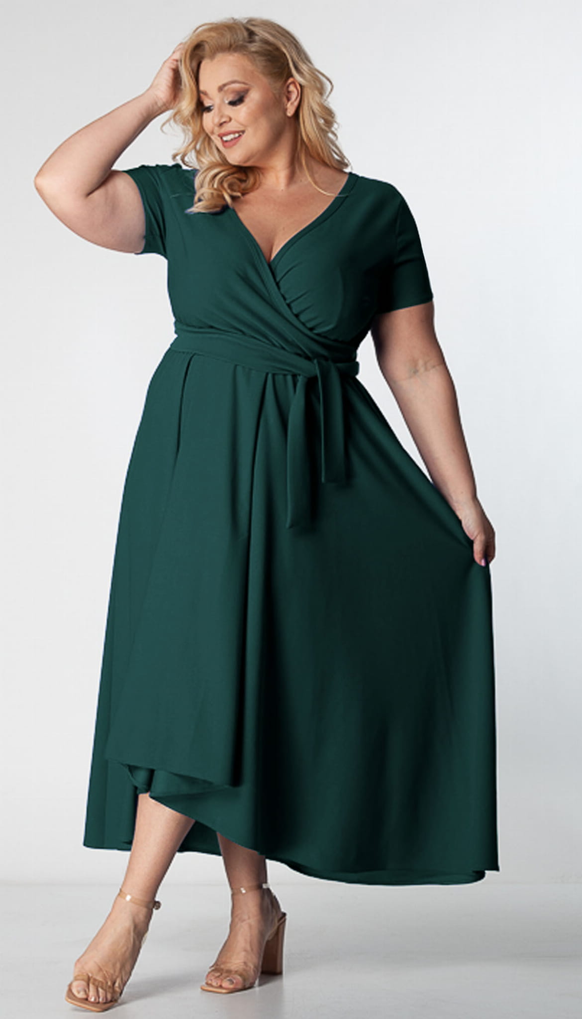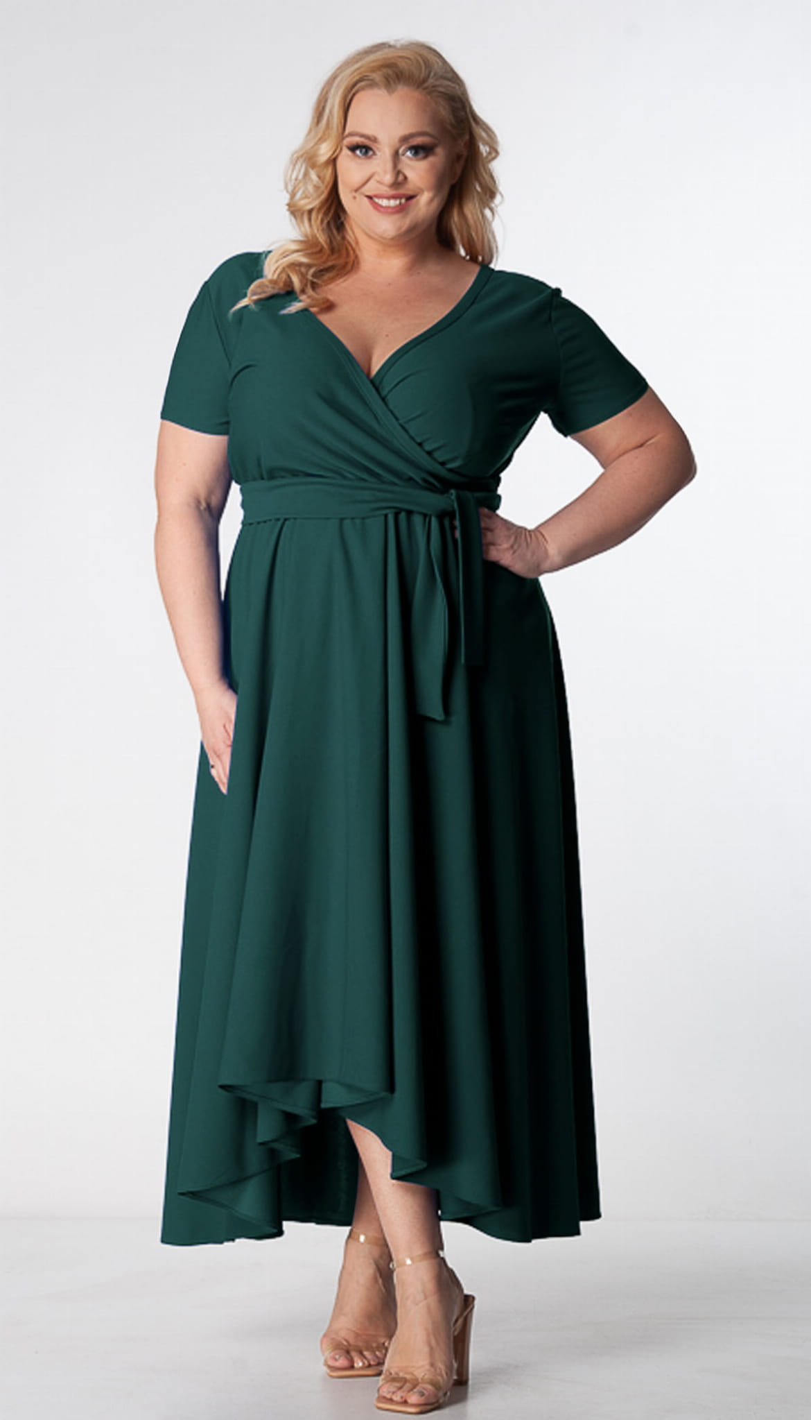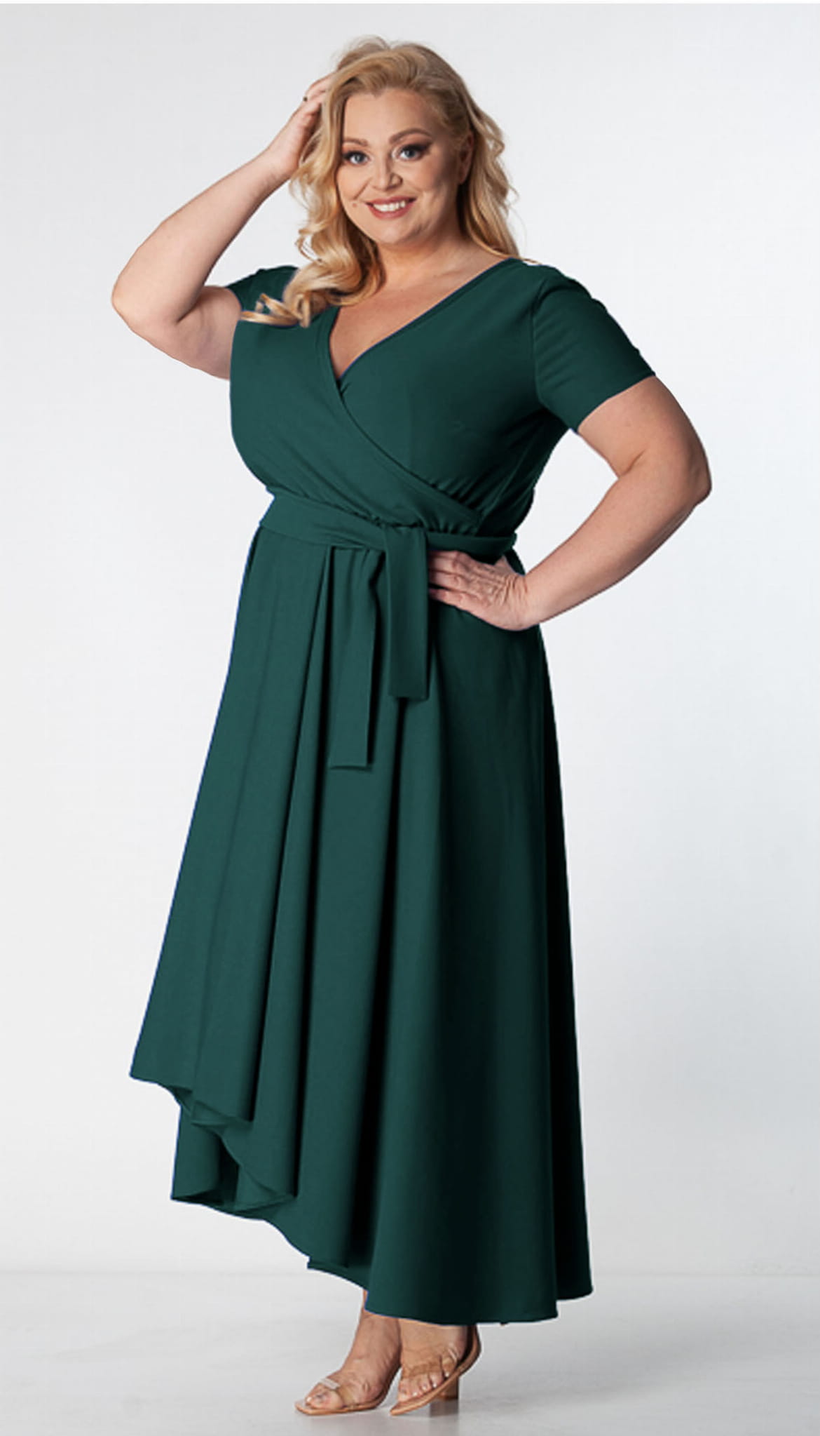 Sukienka Marta to propozycja na wyjątkowe wyjścia. Wesela, bale, studniówki. Idealna dla Pań noszących większe rozmiary. Wyjątkowo kobieca i elegancka. Kopertowy dekolt można odsłonić bardziej lub mniej, jest uciągliwy. Pod biustem wszyliśmy wygodną gumeczkę. Z tyłu, na plecach, zaszewki, głębszy dekolt i zapinanie na kryty suwak. Dół sukienki asymetryczny, rozkloszowany, z przodu z dwiema zakładkami które tuszują okolice brzuszka. Do sukienki dołączony jest pasek, można założyć lub nie. Sukienka bez podszewki.