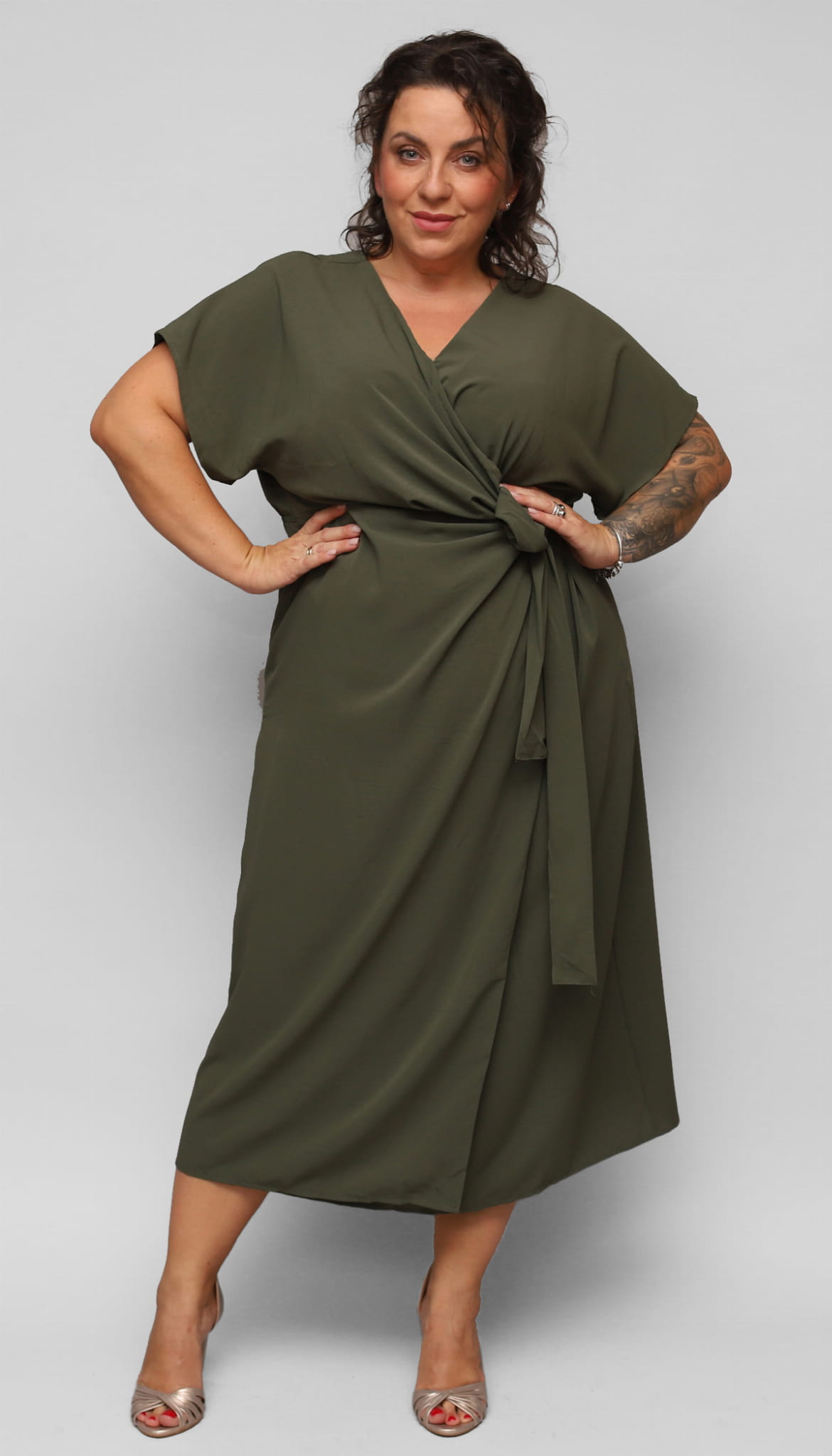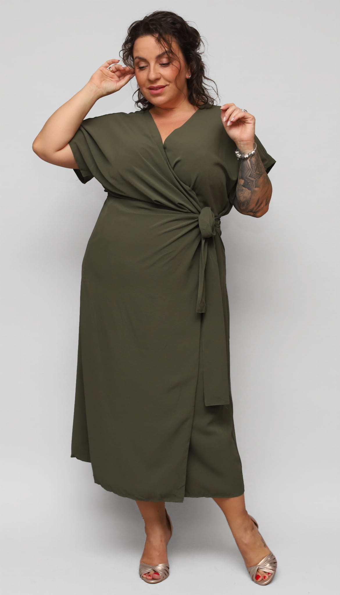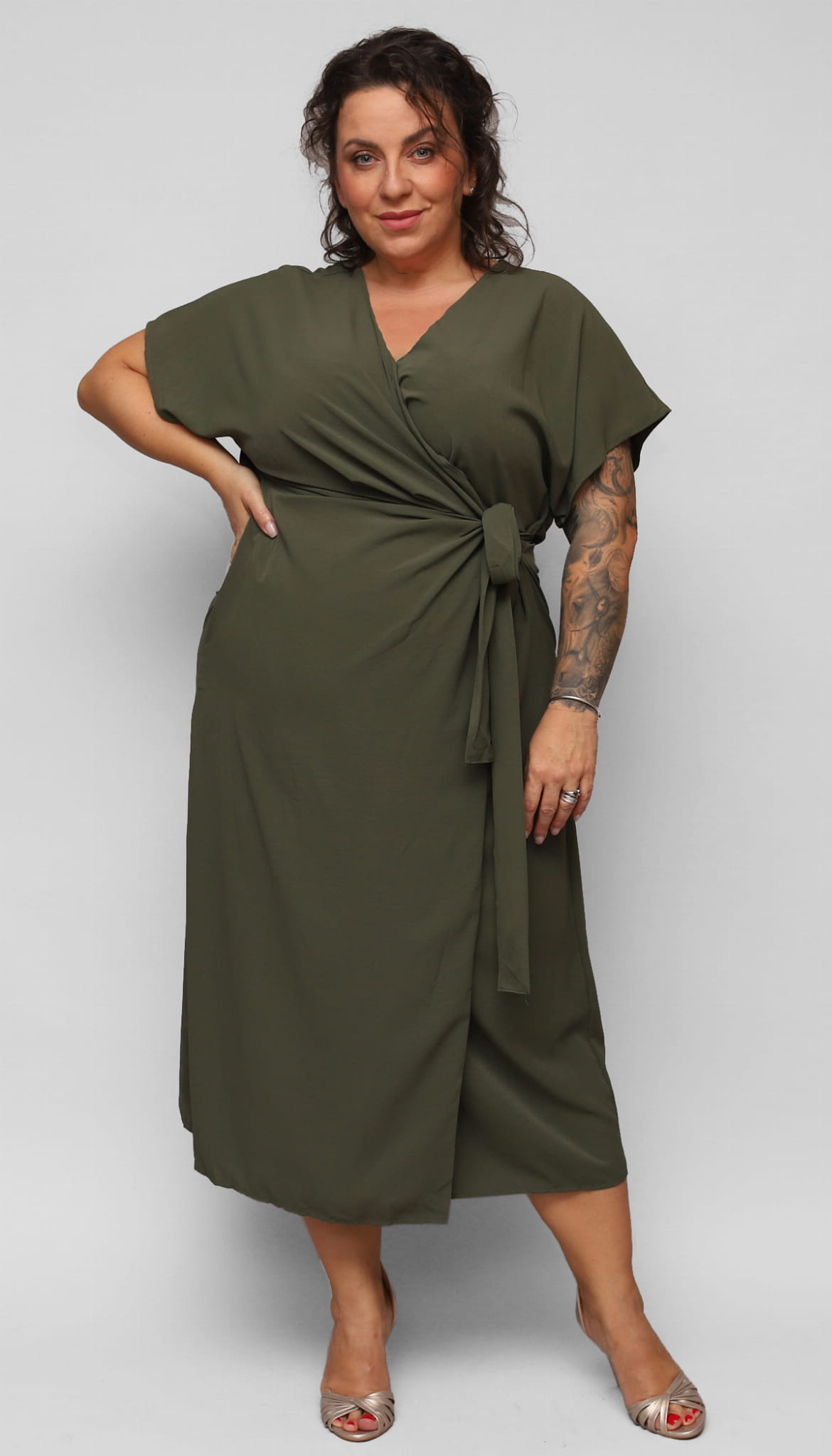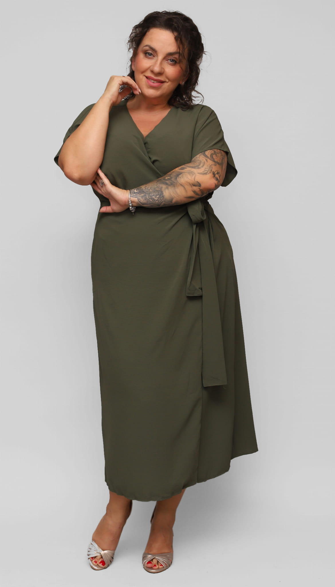 Wygodna, elegancka długa sukienka dla Pani w większym rozmiarze. Z dekoltem kopertowym i szerokim rękawkiem. W talii z wygodną gumką i dodatkowo związywana paskiem. Wzdłuż dołu delikatne pęknięcie dodające wyjątkowości i kobiecości.