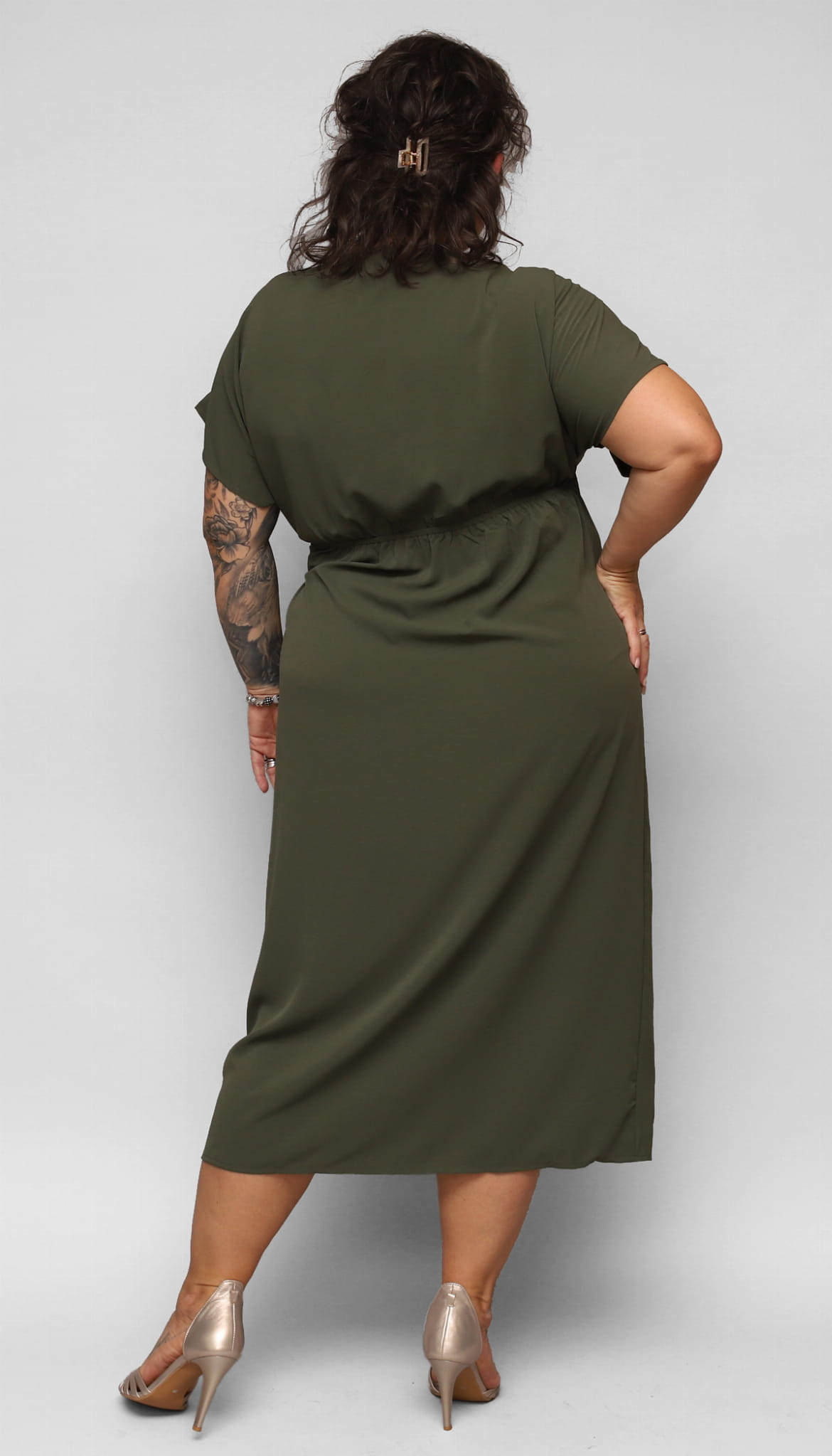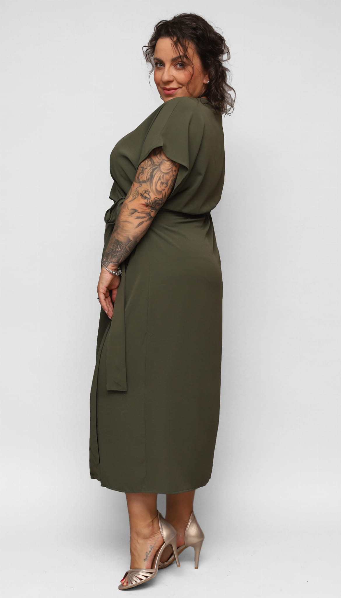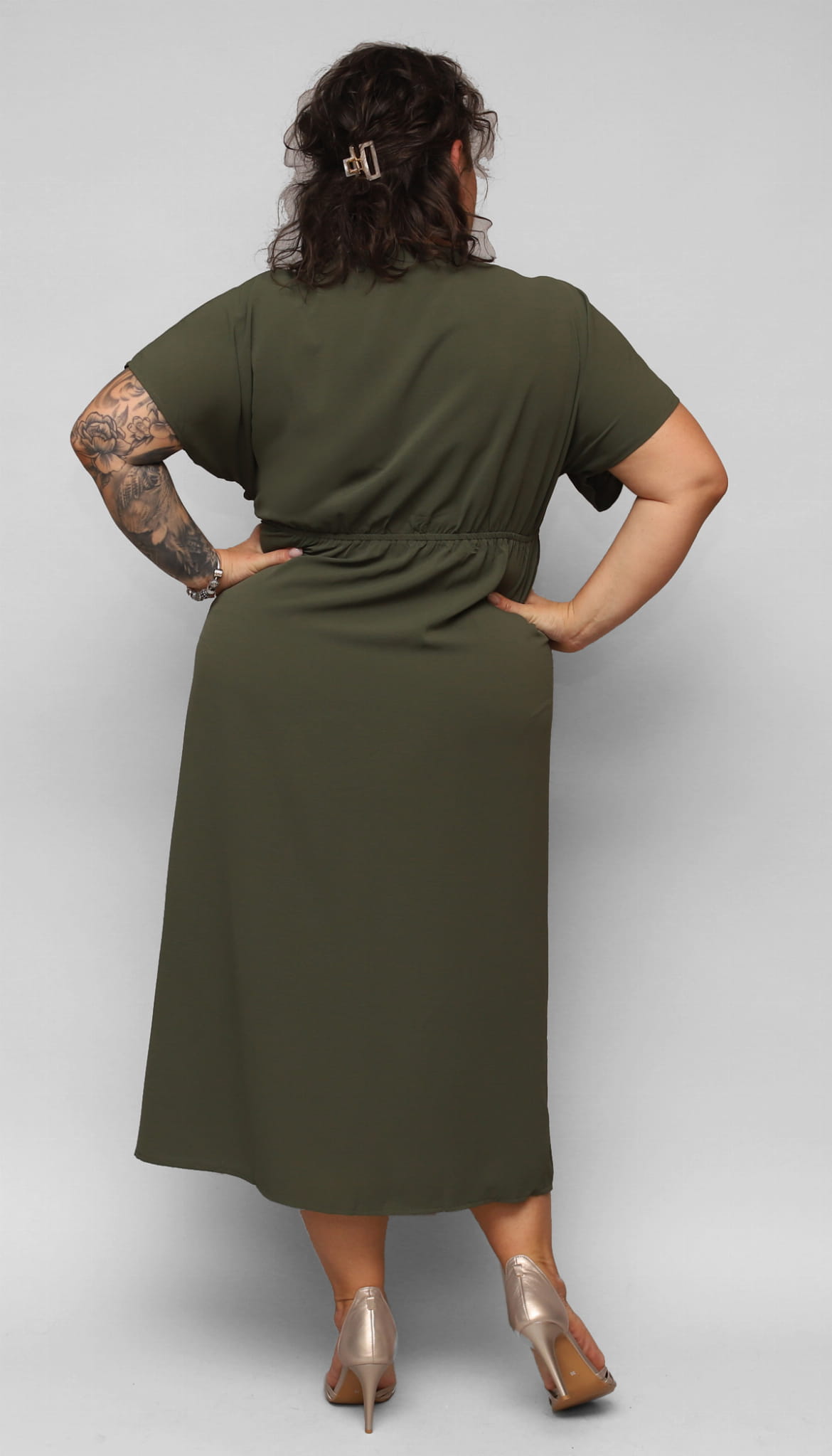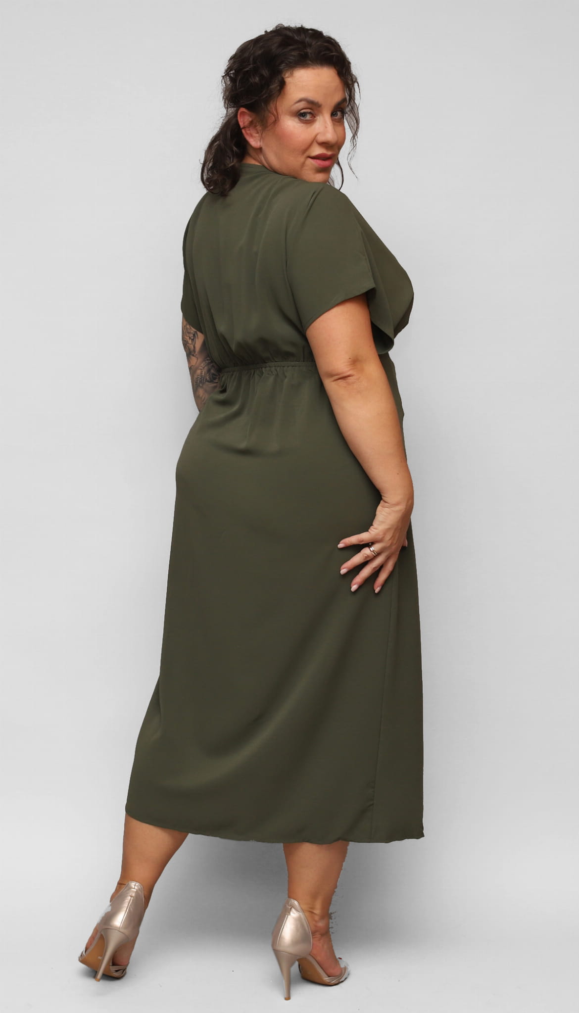 Wygodna, elegancka długa sukienka dla Pani w większym rozmiarze. Z dekoltem kopertowym i szerokim rękawkiem. W talii z wygodną gumką i dodatkowo związywana paskiem. Wzdłuż dołu delikatne pęknięcie dodające wyjątkowości i kobiecości.