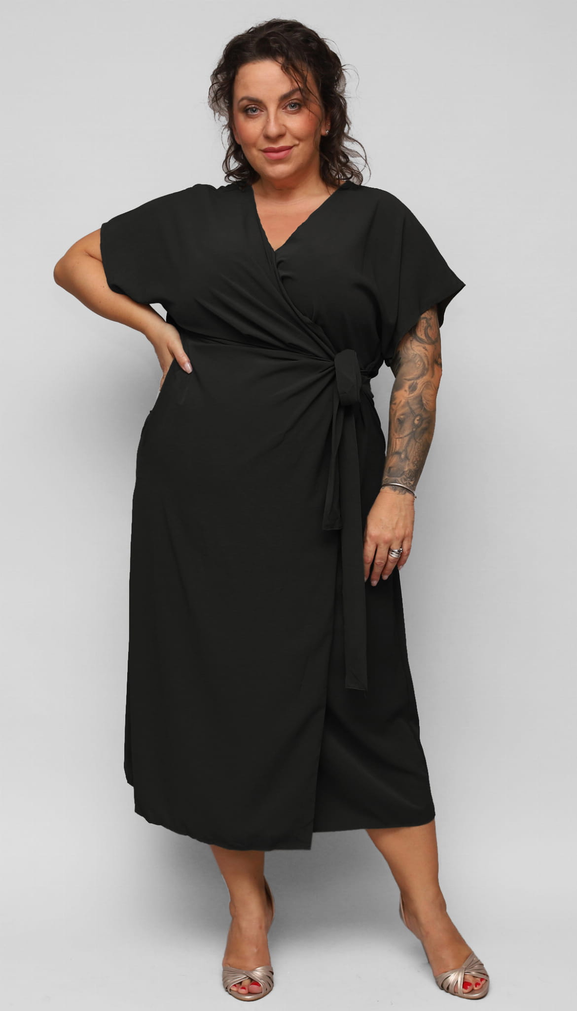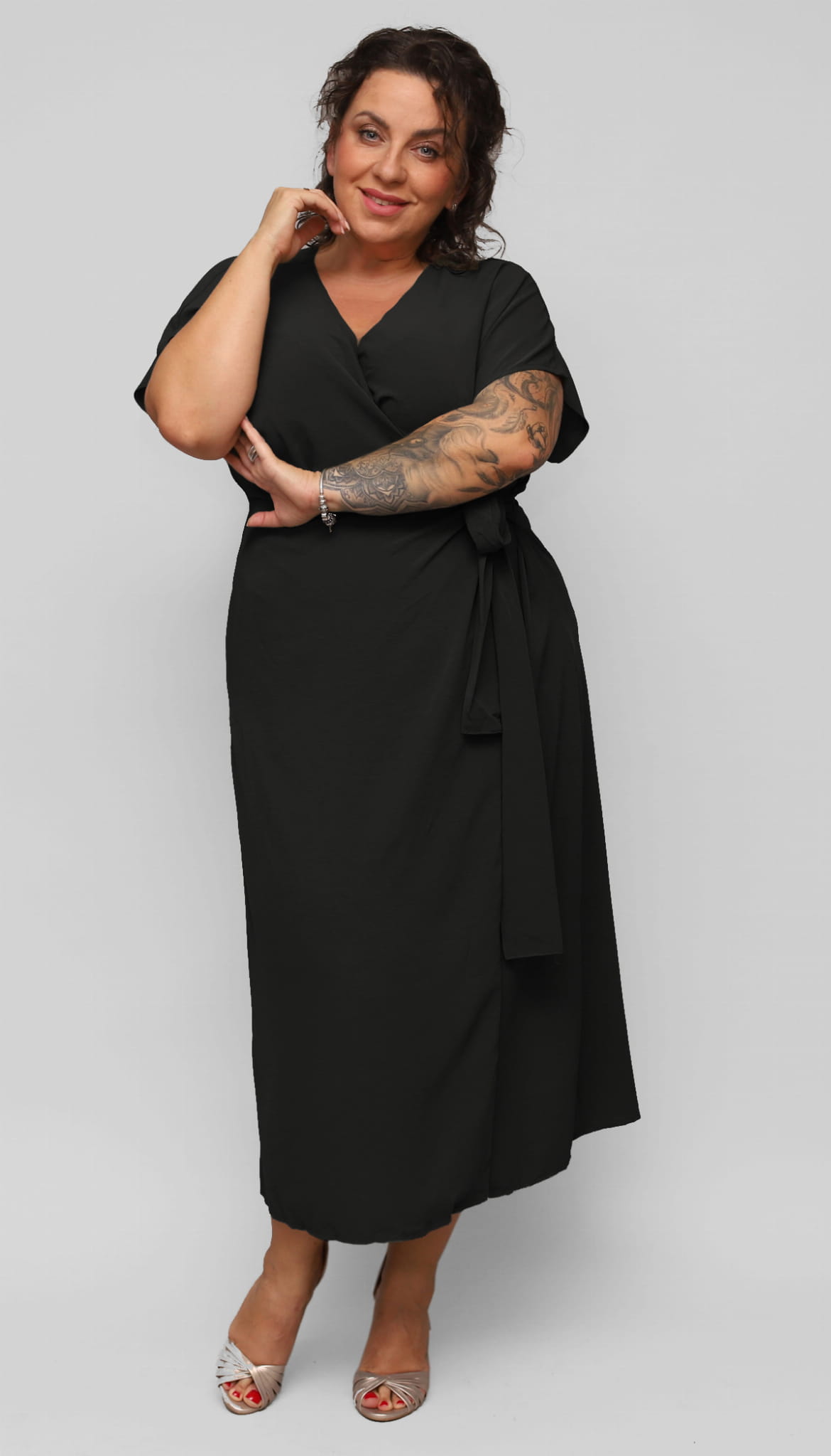 Wygodna, elegancka długa sukienka dla Pani w większym rozmiarze. Z dekoltem kopertowym i szerokim rękawkiem. W talii z wygodną gumką i dodatkowo związywana paskiem. Wzdłuż dołu delikatne pęknięcie dodające wyjątkowości i kobiecości.