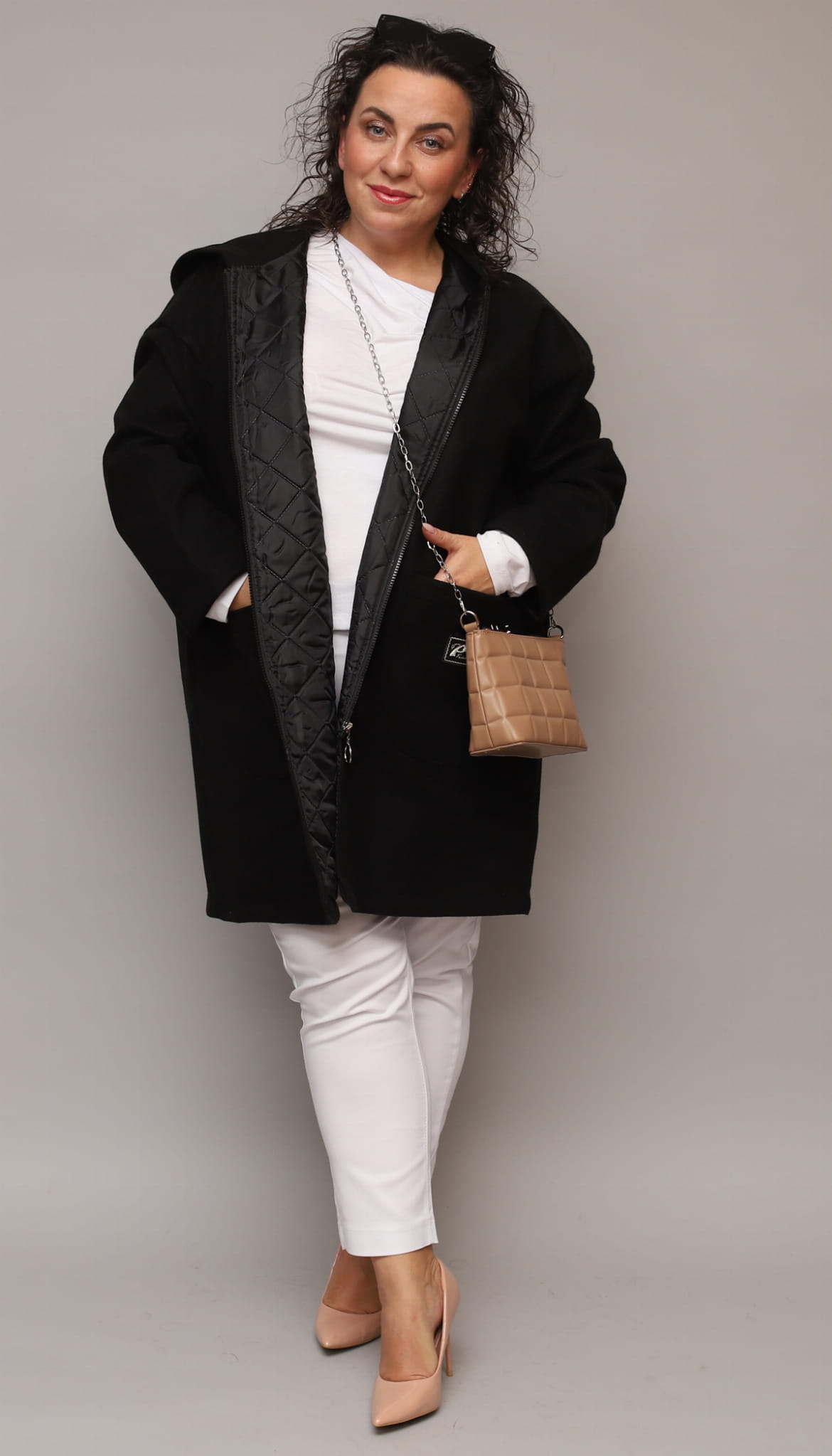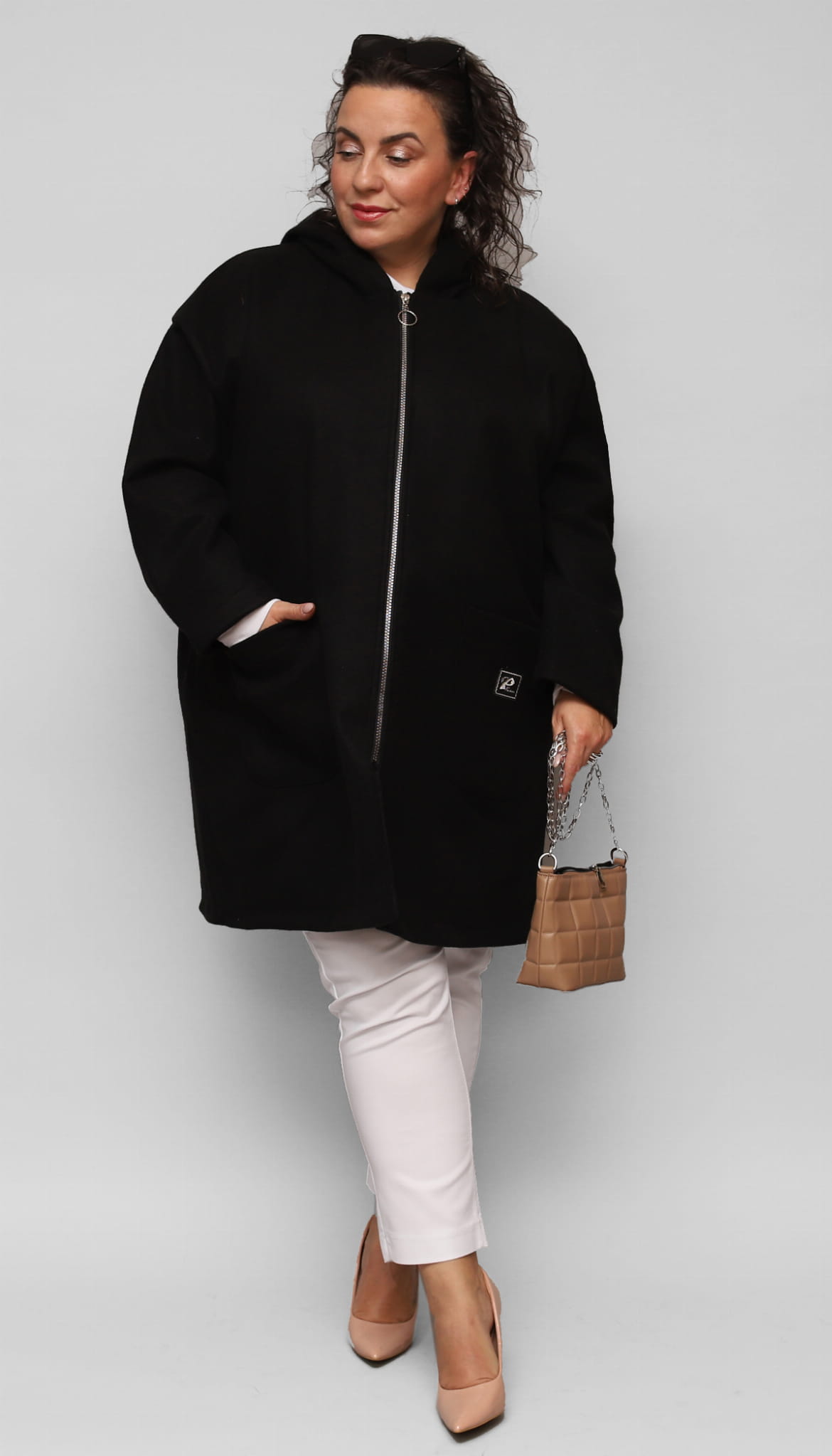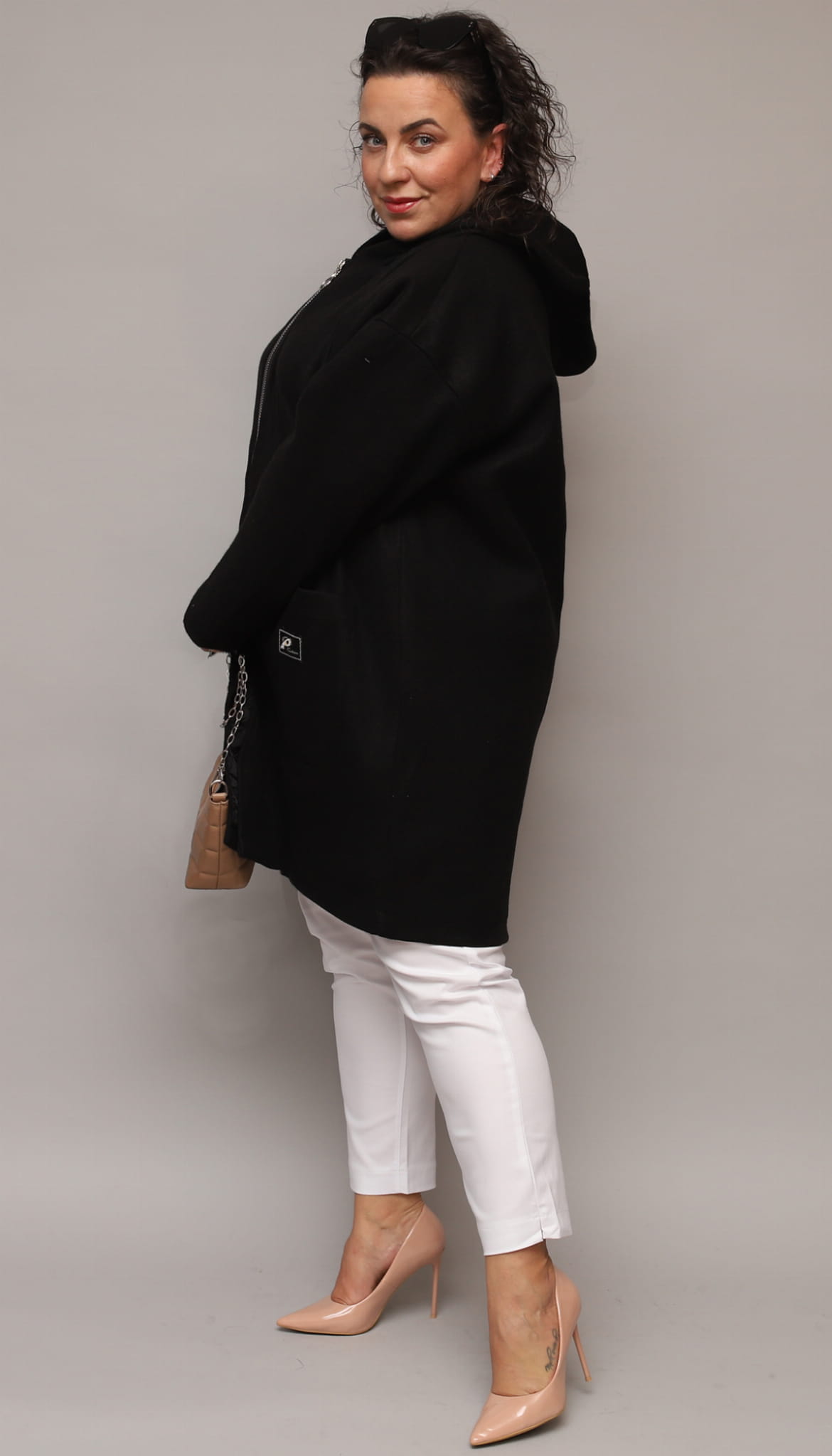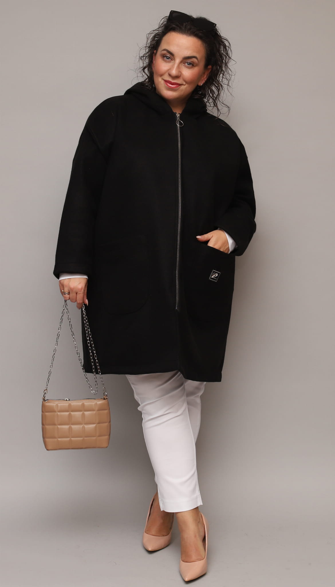 Klasyczny, luźny i wyjątkowo wygodny ocieplany płaszcz dla Pań w większych rozmiarach. Idealny na codzienne wyjścia w chłodniejsze dni. Posiada obszerne kieszenie oraz kaptur. Zapinany na srebrny zamek z ozdobnym kółeczkiem. Na kieszonce delikatna ozdobna aplikacja.