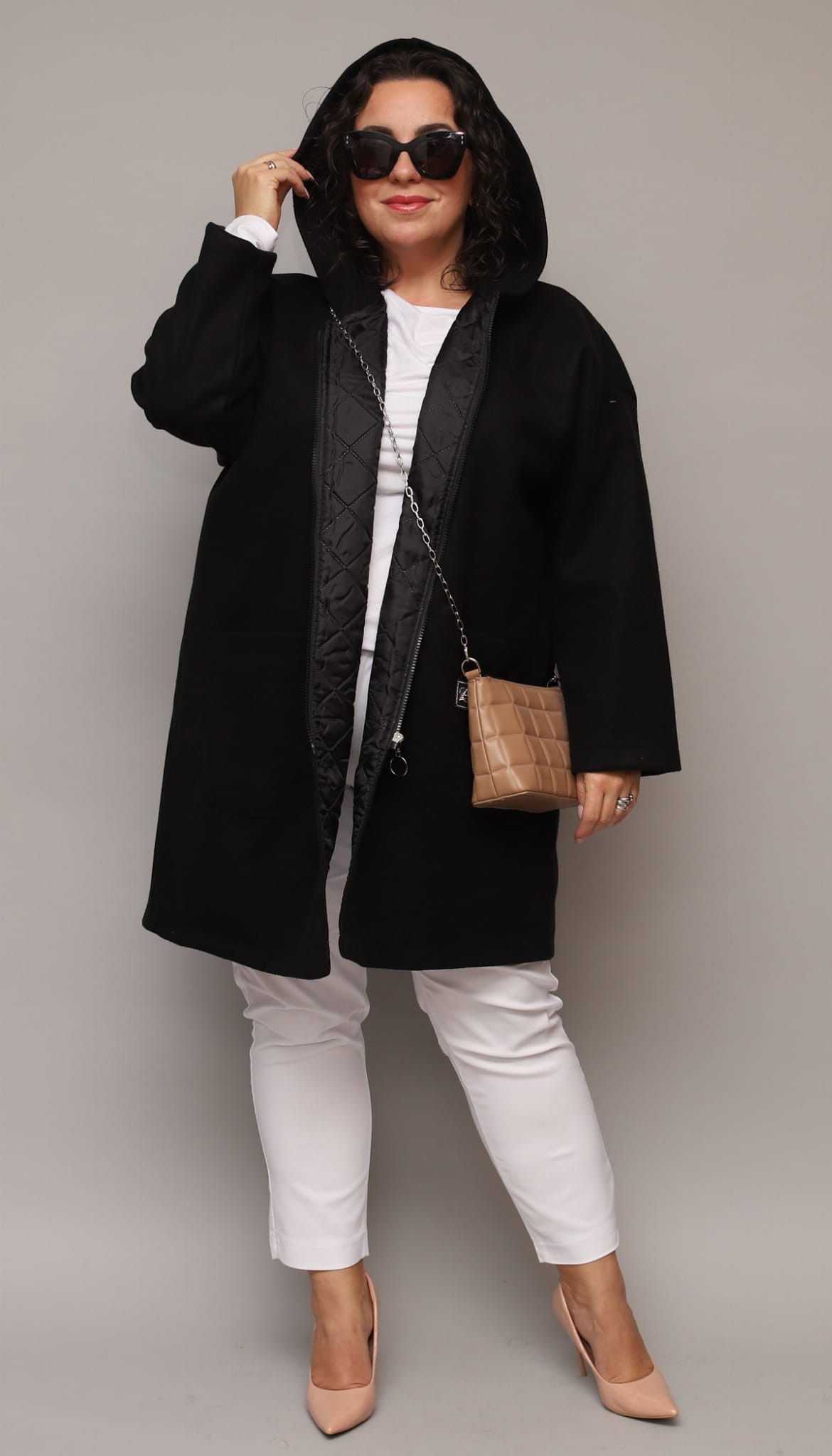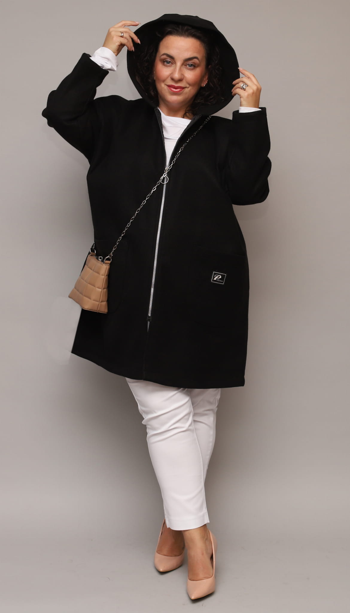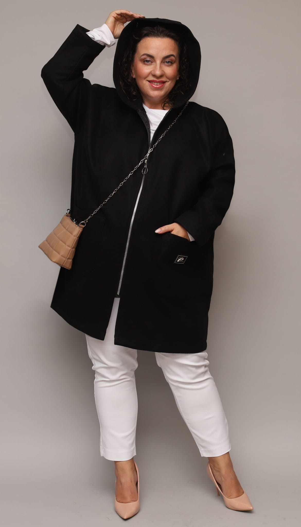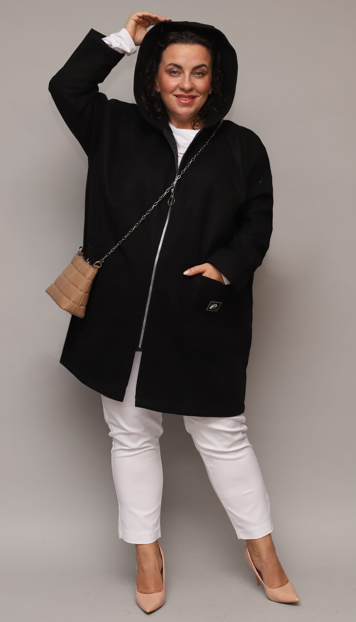 Klasyczny, luźny i wyjątkowo wygodny ocieplany płaszcz dla Pań w większych rozmiarach. Idealny na codzienne wyjścia w chłodniejsze dni. Posiada obszerne kieszenie oraz kaptur. Zapinany na srebrny zamek z ozdobnym kółeczkiem. Na kieszonce delikatna ozdobna aplikacja.