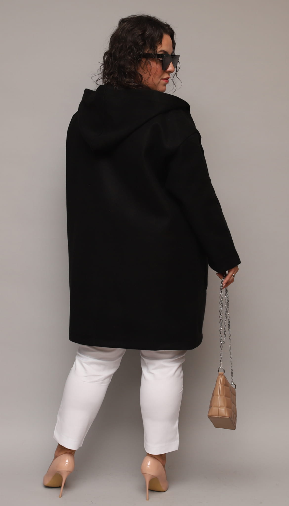 Płaszcz uszyliśmy w jednym uniwersalnym rozmiarze. Będzie dobry dla Pań od 46 - jako oversize - aż do 54.