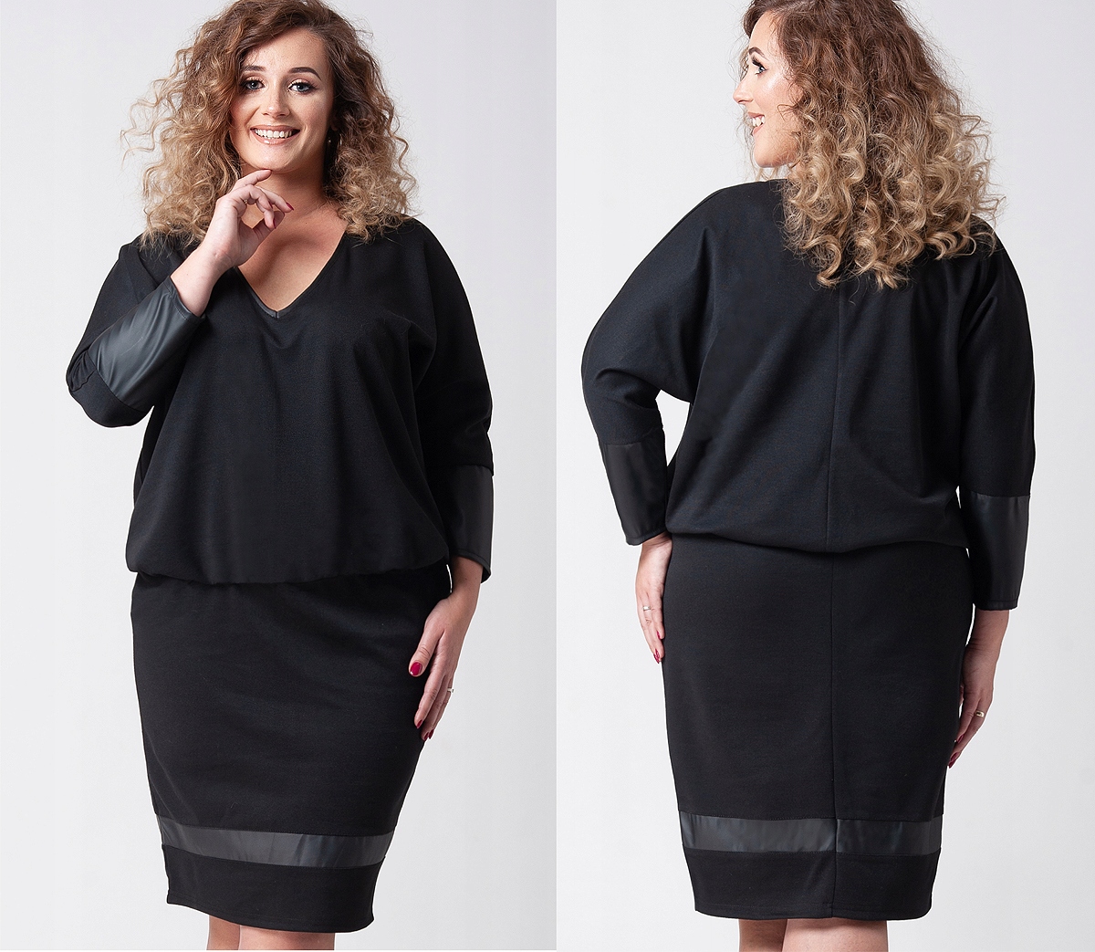 Dzianinowa sukienka kimonowa z subtelnymi dodatkami z ekoskórki. Zbluzowana góra przytuszuje niedoskonałości w okolicach talii i brzuszka.