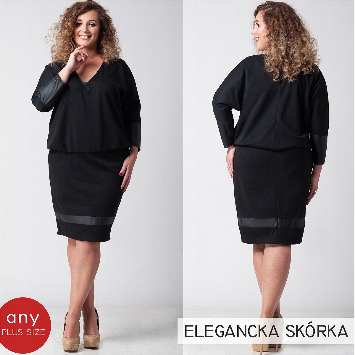 NA TEJ AUKCJI ELEGANCKA TUSZUJĄCA BRZUSZEK SUKIENKA Z ELASTYCZNEJ DZIANINKI Z EKOSKÓRKĄ