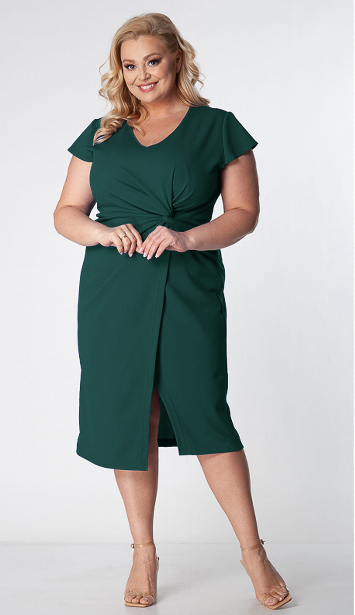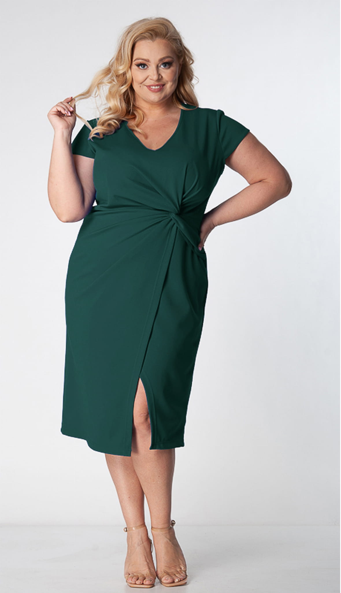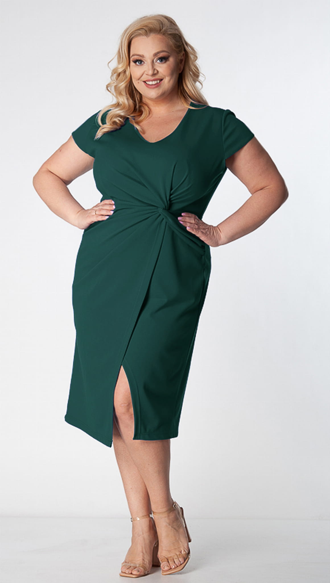 Sukienka Klara jest propozycją dla Pań chcących zatuszować okolice talii i brzuszka. Posiada ona ciekawie zaprojektowany supeł który rozchodzi się w talii i biegnie w kierunku biustu. Supeł zasłania i koryguje te okolice sylwetki. Ponadto sukienka ma dekolt w serek który wysmukli szyję. Na uwagę zasługuje też ciekawe rozcięcie lekko odsłaniające nogi. Uszyliśmy ją z eleganckiego, poddającego się materiału. Poczujecie się w niej Panie komfortowo i elegancko. Sukienka sprawdzi się podczas przeróżnych uroczystości, wesel, chrzcin czy urodzin w najbliższym gronie. Każda XXL-ka poczuje się w niej wyjątkowo pięknie.