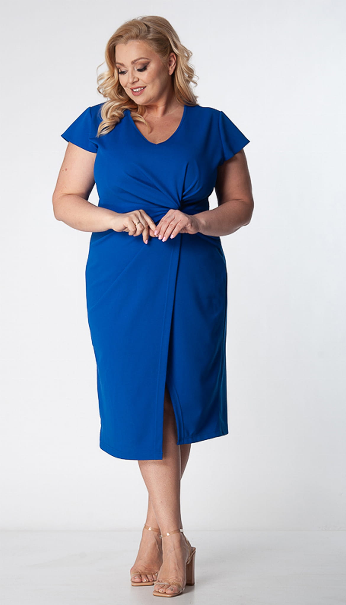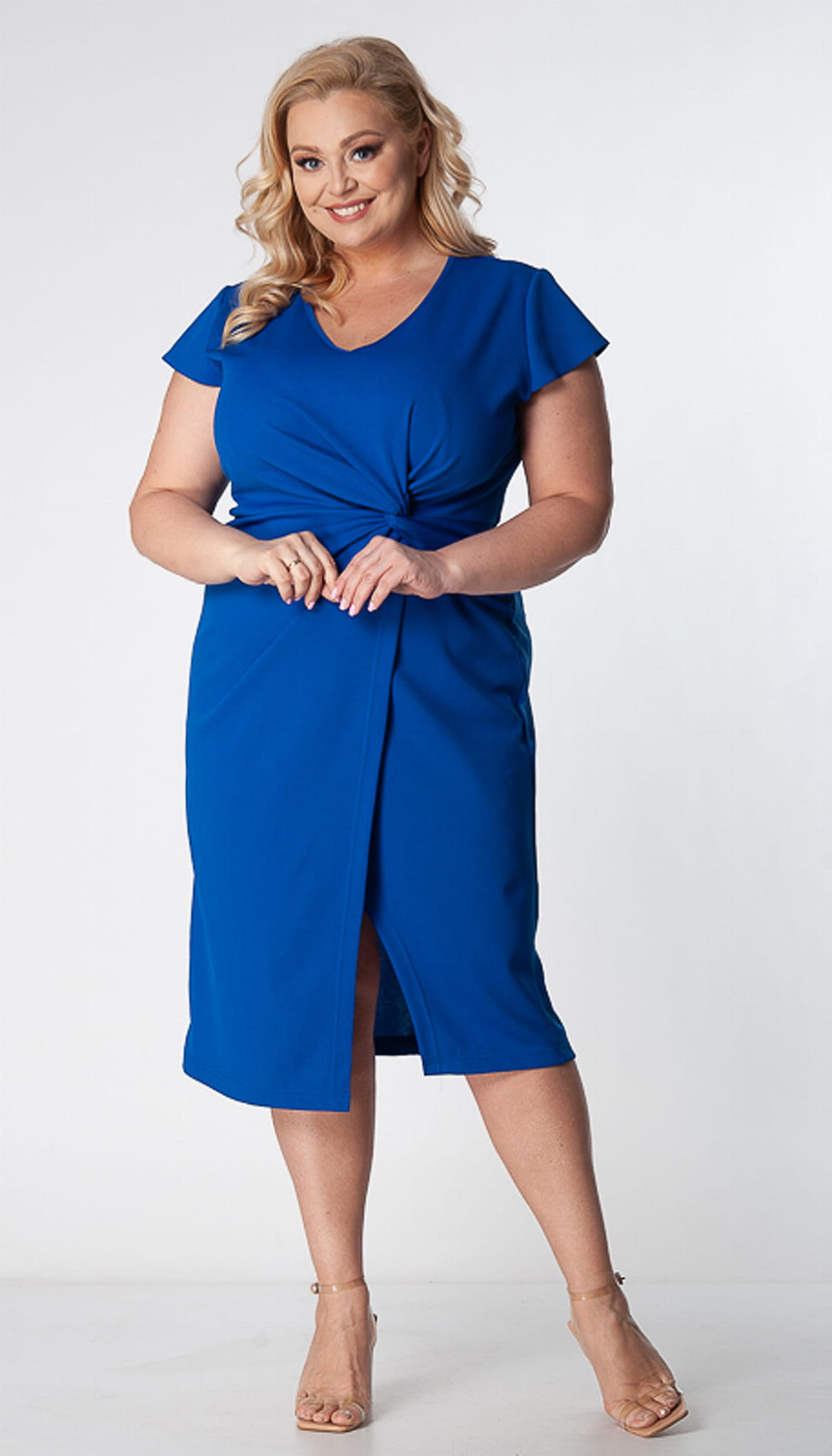 Sukienka Klara jest propozycją dla Pań chcących zatuszować okolice talii i brzuszka. Posiada ona ciekawie zaprojektowany supeł który rozchodzi się w talii i biegnie w kierunku biustu. Supeł zasłania i koryguje te okolice sylwetki. Ponadto sukienka ma dekolt w serek który wysmukli szyję. Na uwagę zasługuje też ciekawe rozcięcie lekko odsłaniające nogi. Uszyliśmy ją z eleganckiego, poddającego się materiału. Poczujecie się w niej Panie komfortowo i elegancko. Sukienka sprawdzi się podczas przeróżnych uroczystości, wesel, chrzcin czy urodzin w najbliższym gronie. Każda XXL-ka poczuje się w niej wyjątkowo pięknie.