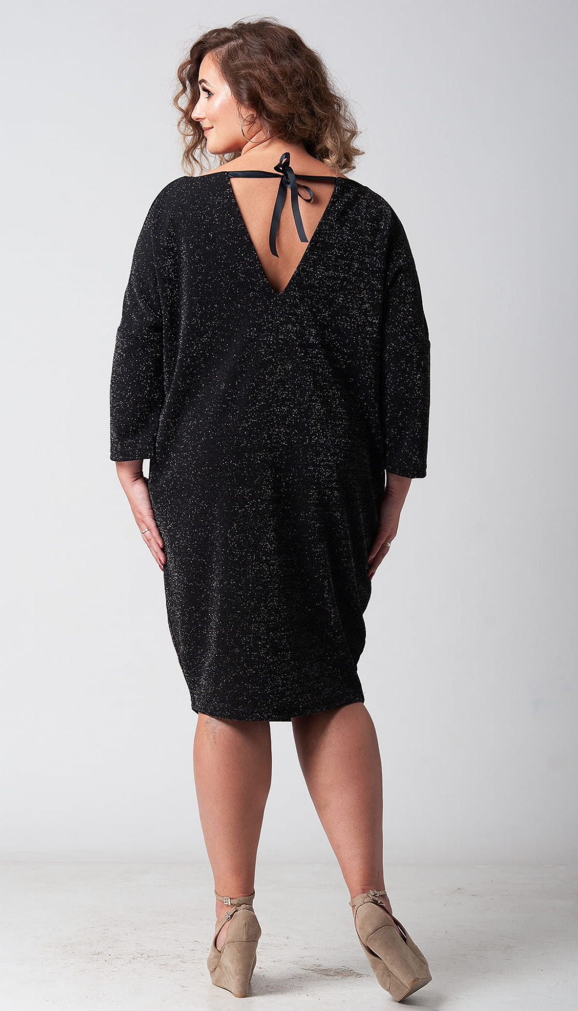 Niezwykle elegancka a zarazem skromna sukienka o kroju tuby dla Pani w rozmiarze XXL. Rękawy kimonowe. Uszyta z elastycznej POŁYSKUJĄCEJ DZIANINY ZE SREBRNĄ NITKĄ. Dzianina wygodna, mocno elastyczna, od wewnątrz czarna, nie gryząca. Zabłyśnij i ukryj niedoskonałości!