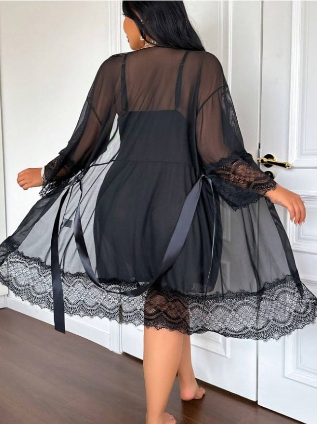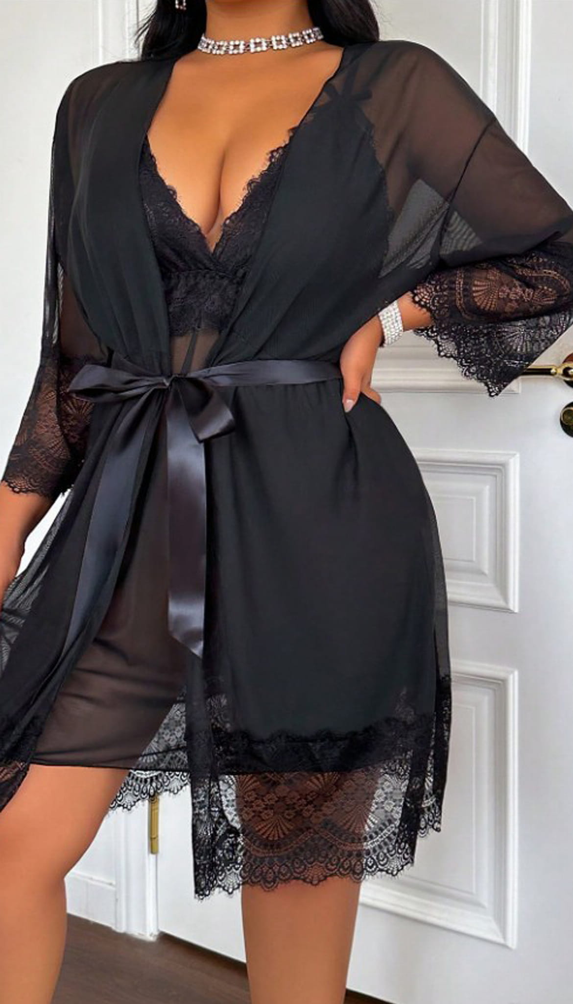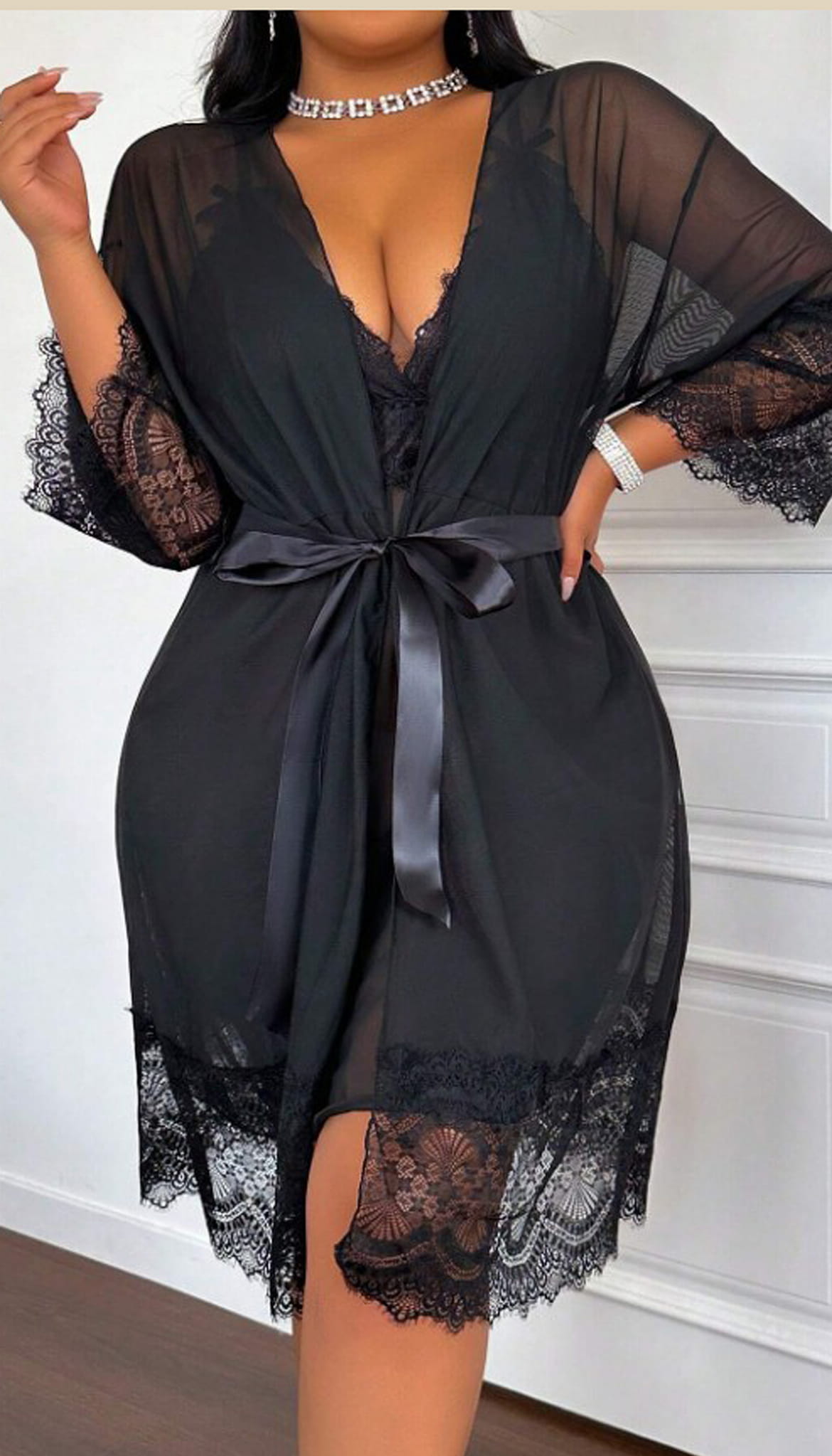 ✅ Szlafrok odpowiednio większy i rozmiarowo dopasowany do koszulki z atłasowym paskiem oraz wykończony również koronką.